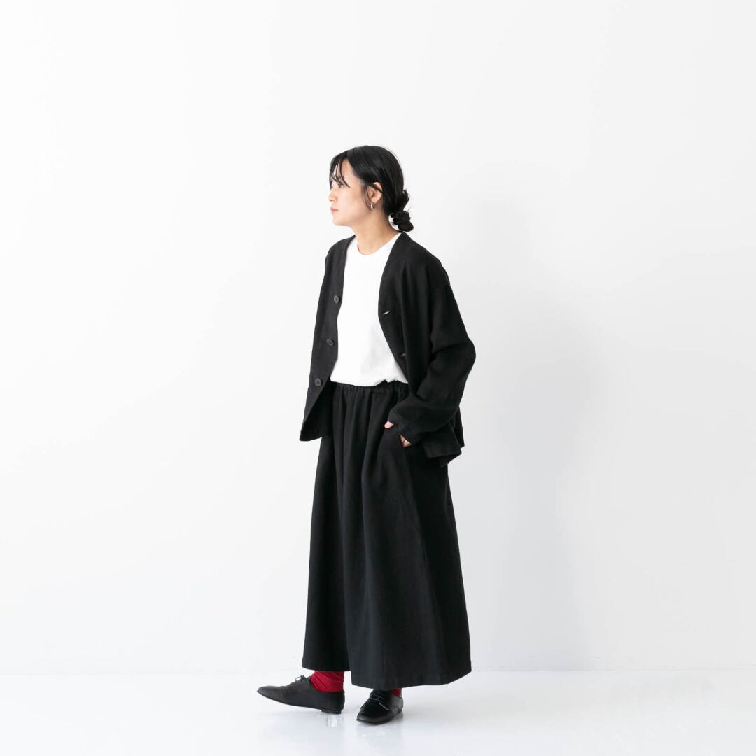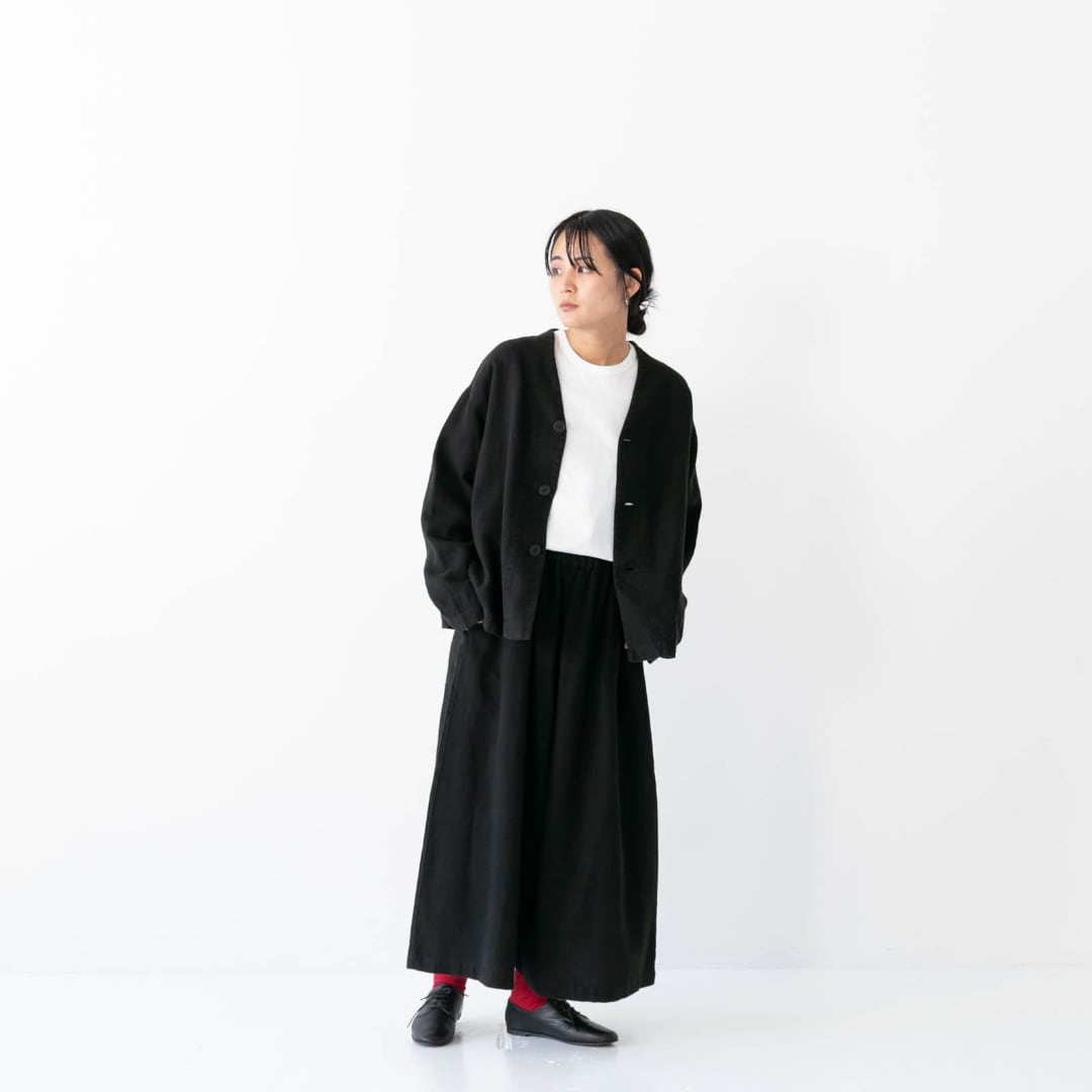 A1. 25番単糸で作った麻100%生地を使用しています。起毛を施すことで、程よい厚みとウォーム感のある風合いに仕上げています。