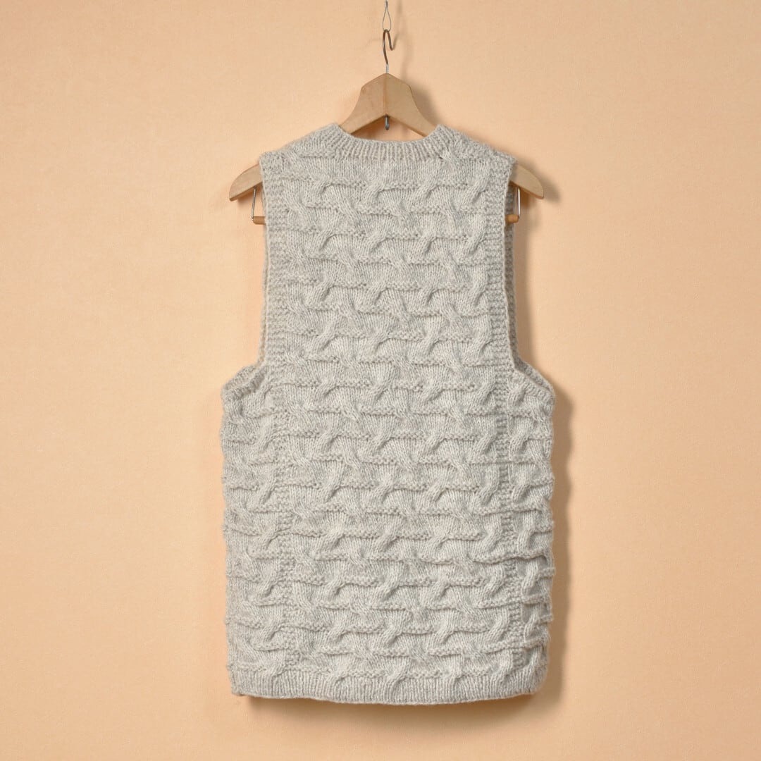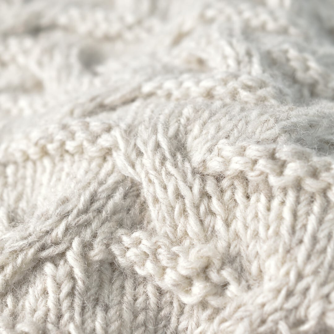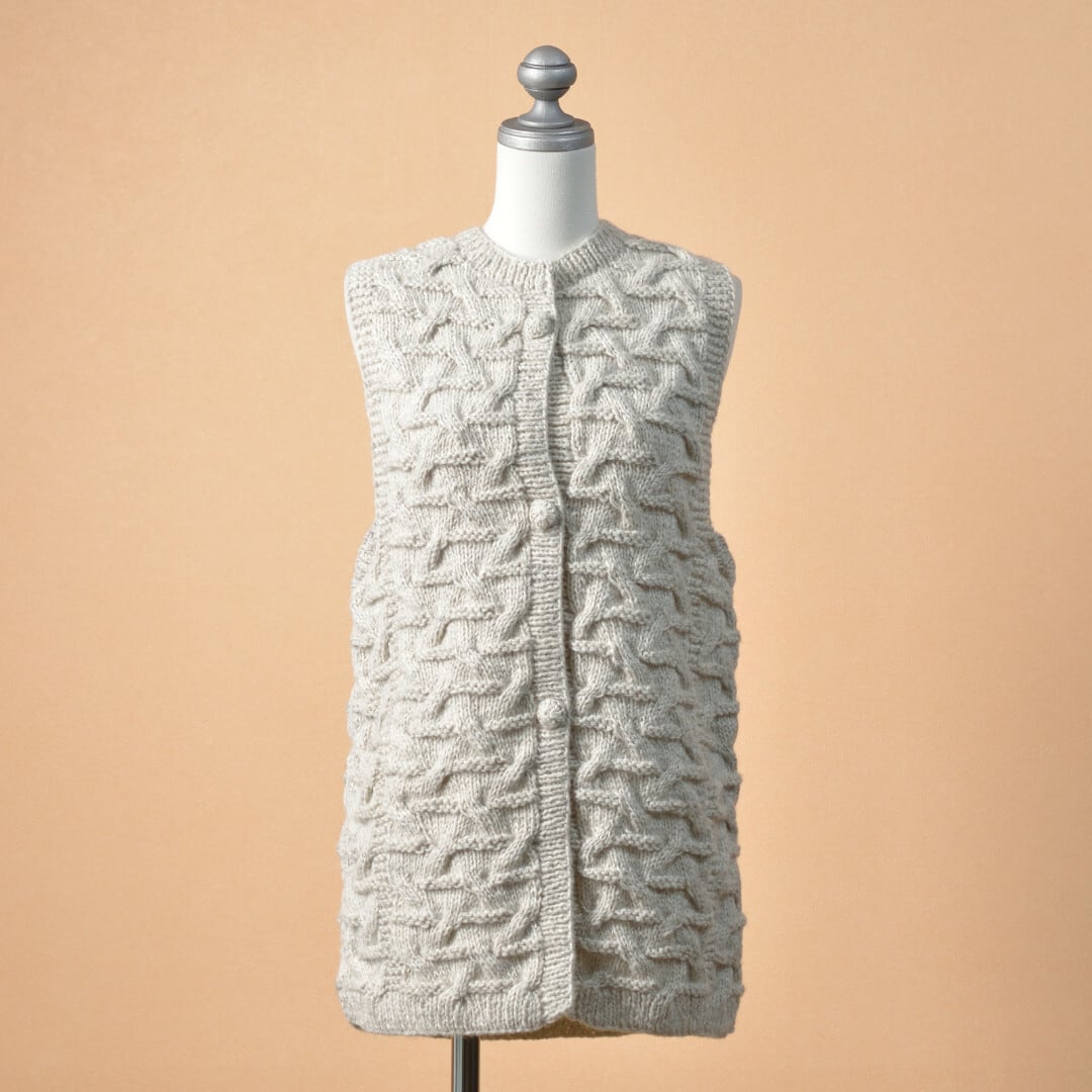 A: 複雑な編み柄と太番手による独特の凹凸感が、機械編みでは表現できない手編みならではの質感と表情を作り出します。