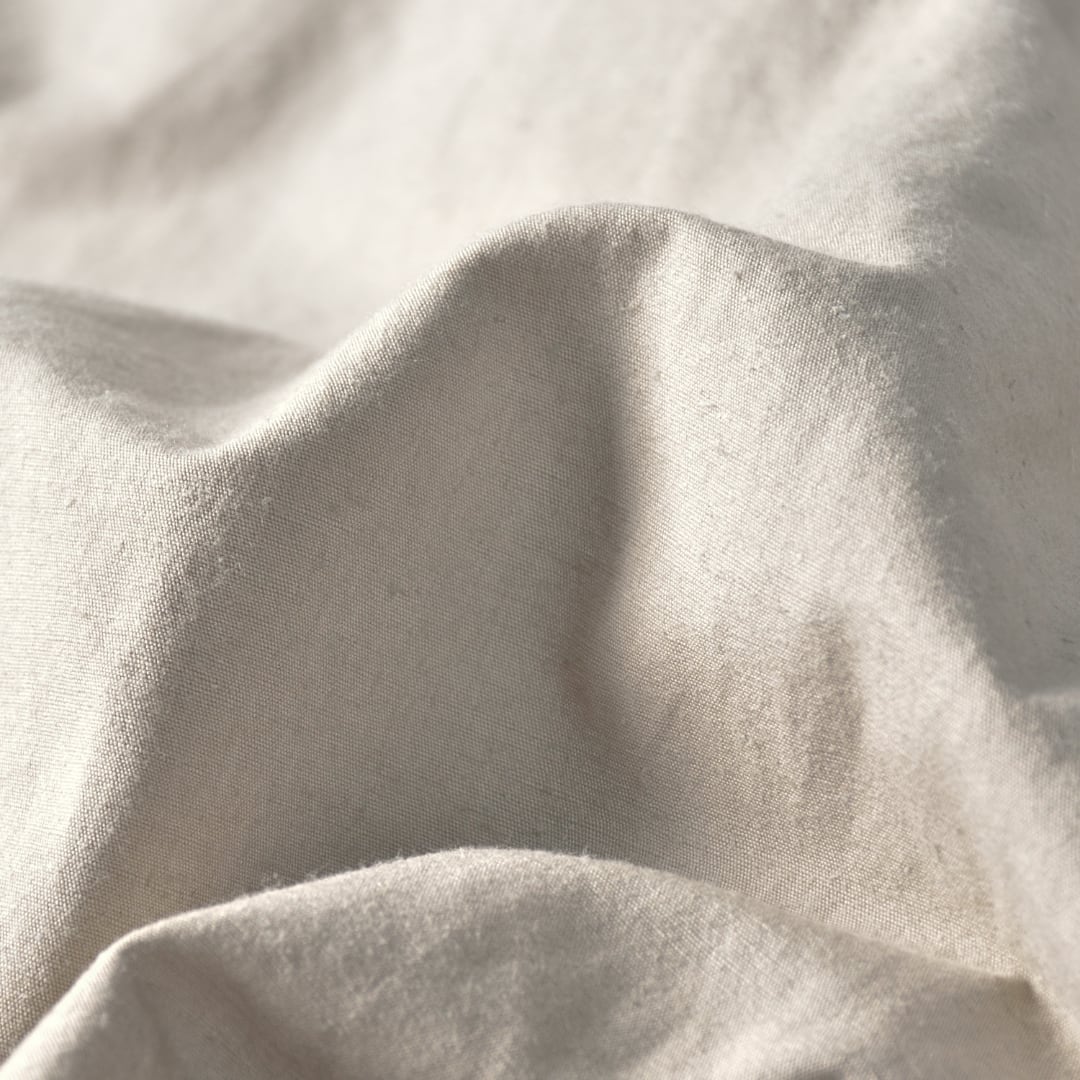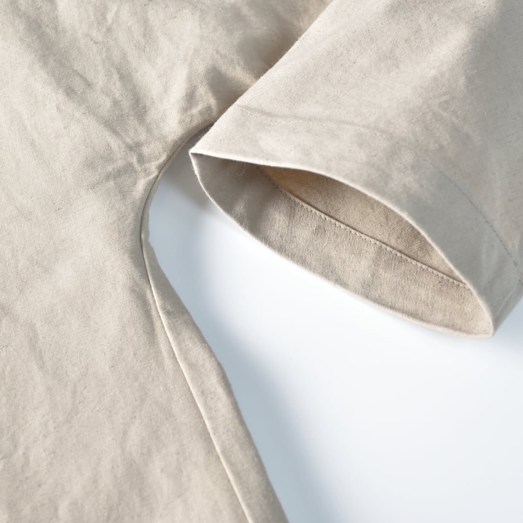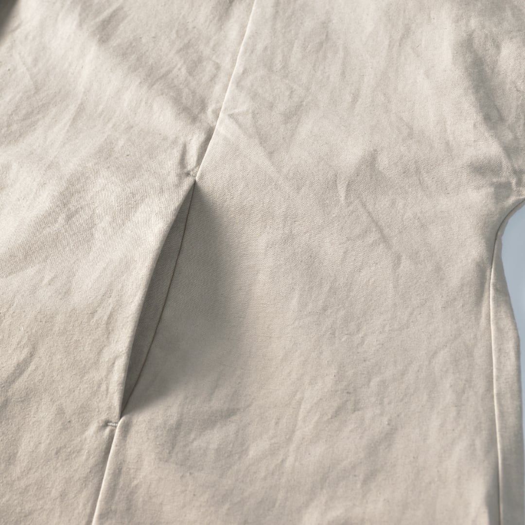 A: 程よいハリ感のあるコットンヘンプ素材を使用しています。ドライな肌触りと厚みのある生地が特徴で、立体的で美しいシルエットを保ちます。