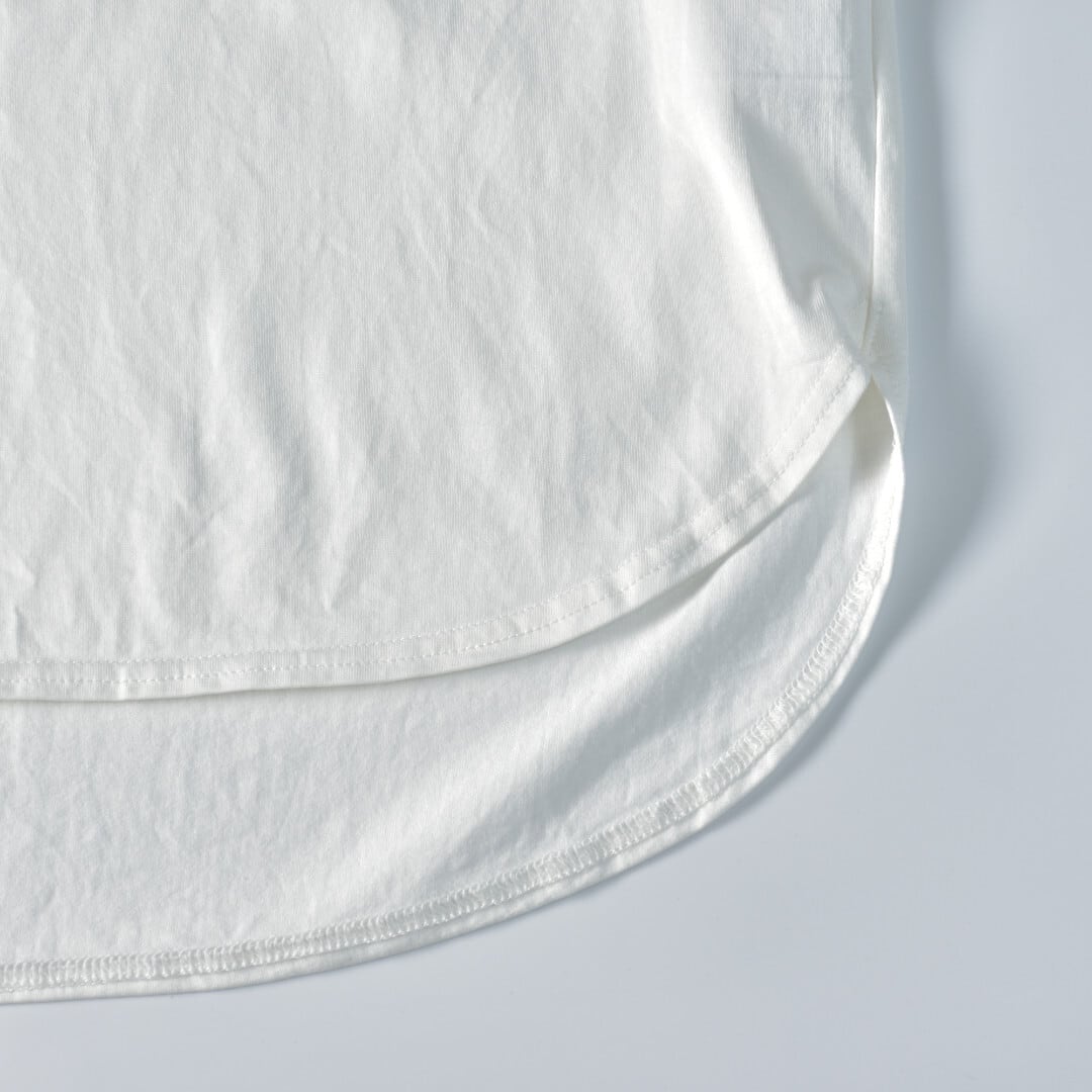 大きくラウンドした裾が、ヒップや腰まわりをさりげなくカバーしながら、すっきりとしたシルエットを演出。袖丈も絶妙なバランスで、さまざまなスタイリングに合わせやすいシンプルな1枚です。