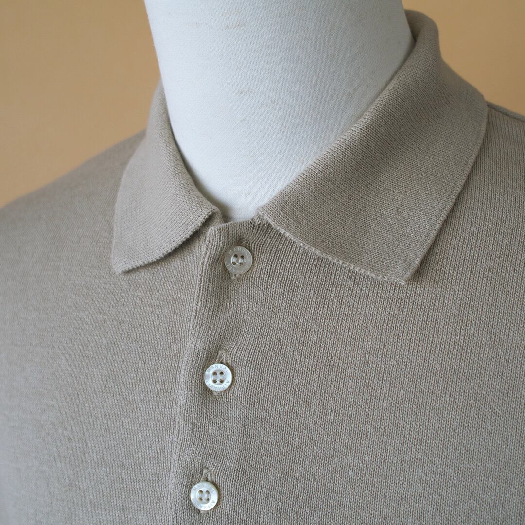 【商品詳細】光沢のあるコットンコーマ糸にリネンをブレンドした綿麻ニットです。コットンリネン特有の清涼感の有るニットに仕上がっています。デザインはオーソドックスですが、編み立ての工夫が随所に施されていますので、ご着用頂いたときにきれいな大人らしいニットポロとなります。ジャケットやコートのインナーにもおすすめです。