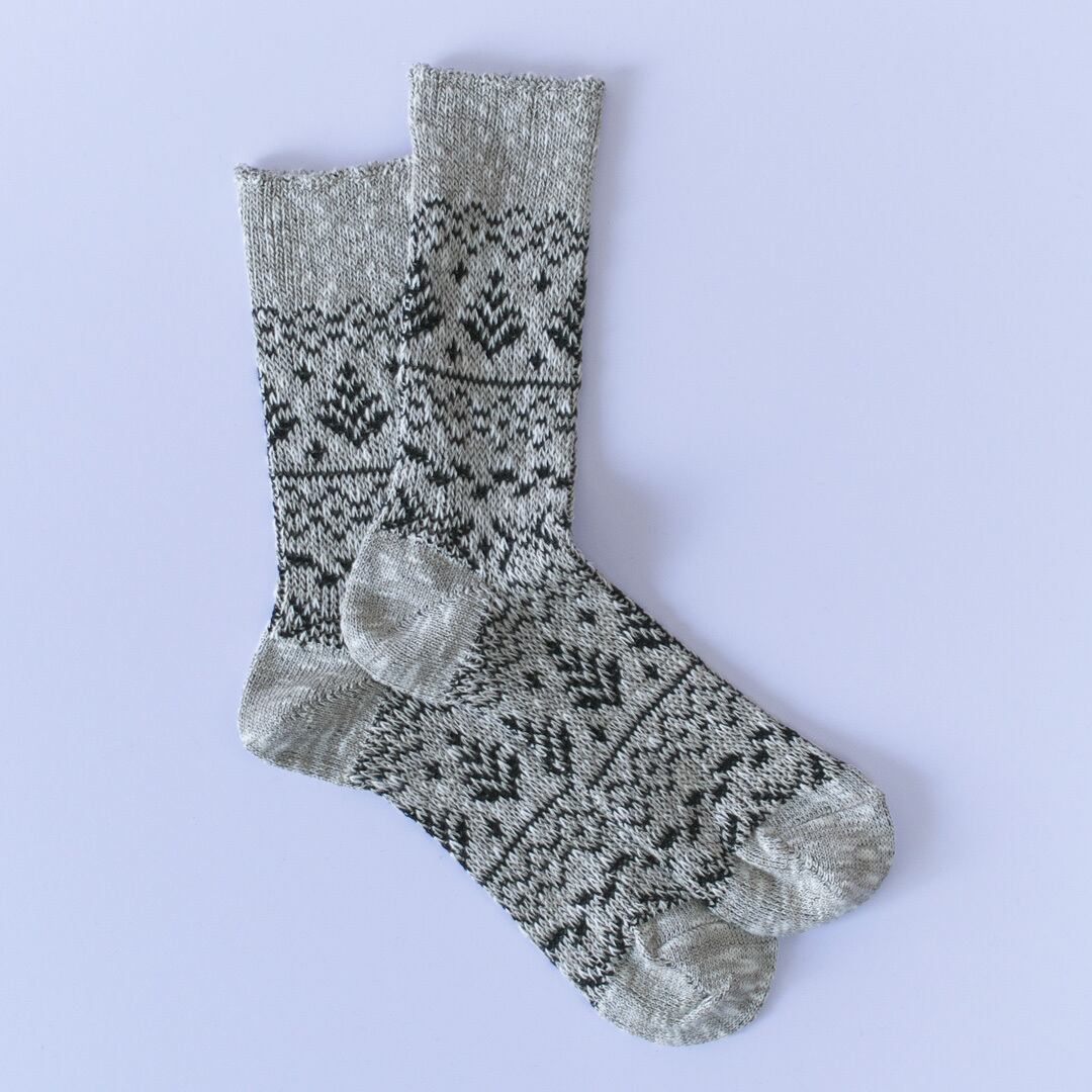 【商品詳細】木や葉の柄を幾何学模様で森をイメージしたソックスです。リネンとスラブ糸を引き揃えて編み立てた素朴な素材感がポイントです。シンプルなカラーはコーディネートしやすい一足です。