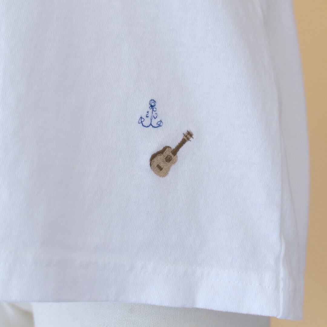 【商品詳細】自然なムラ糸のラフィーコットンを使って、今では有名になった高い技術を持つ和歌山の工場でゆっくりと吊り編み機で編まれた天竺生地を使ったTシャツです。夏らしい太陽をイメージしたTシャツです。裾には20周年のアンカーとウクレレの刺繍があります。サイズはちょっと大きめの3+となっています。