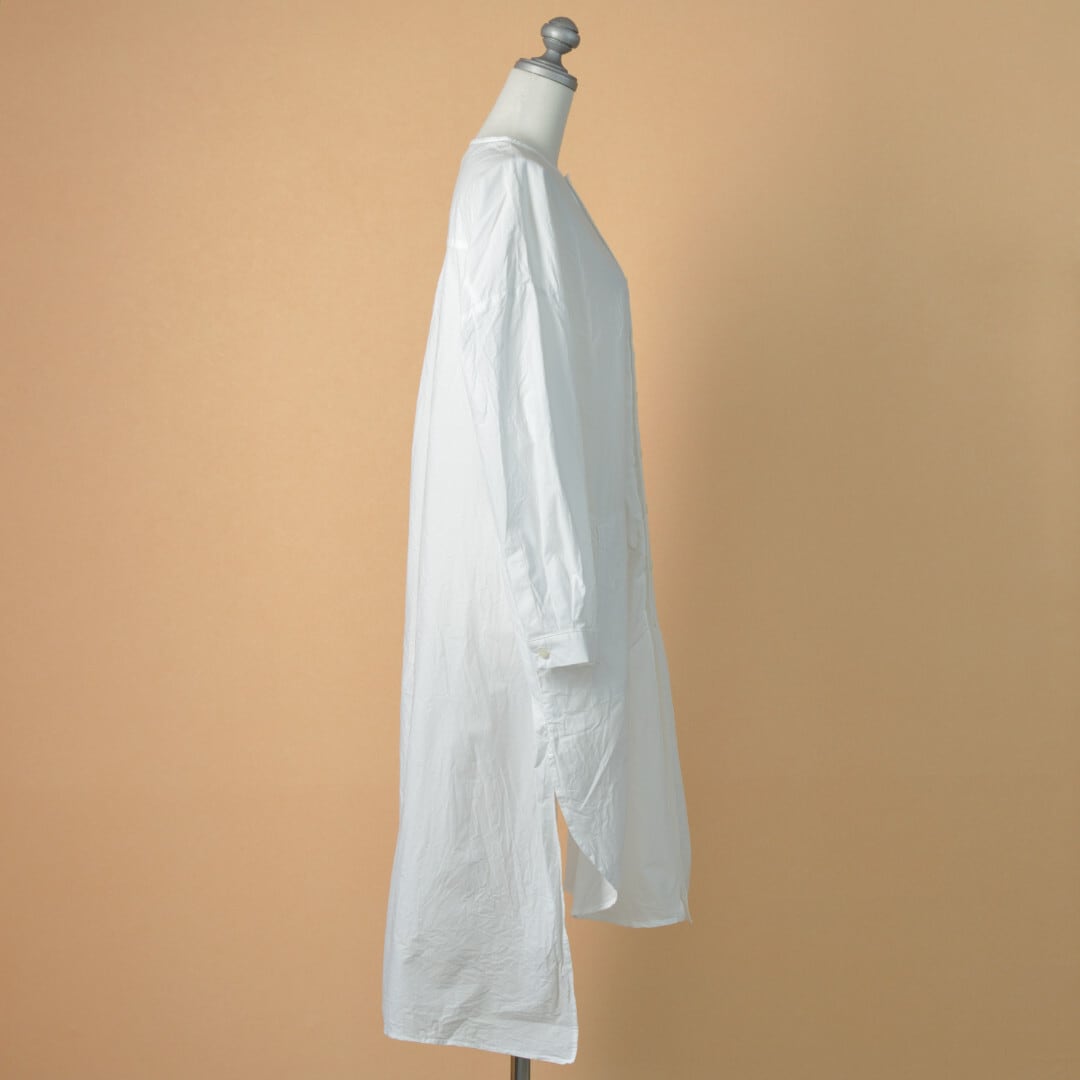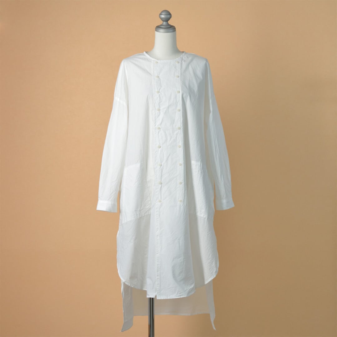 【商品詳細】定番のコックシャツがワンピース仕様でリリースされました。張りのあるコットンタイプライター生地はそのままに、ゆったりとしたレイヤースタイルをお楽しみ頂けます。ニットやワンピース・パンツとのレイヤーコーデで幅広いスタイリングで使えます。