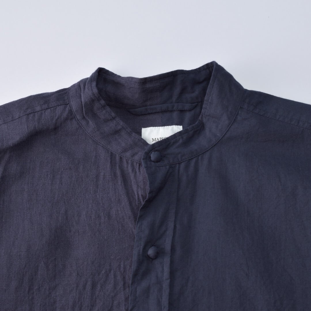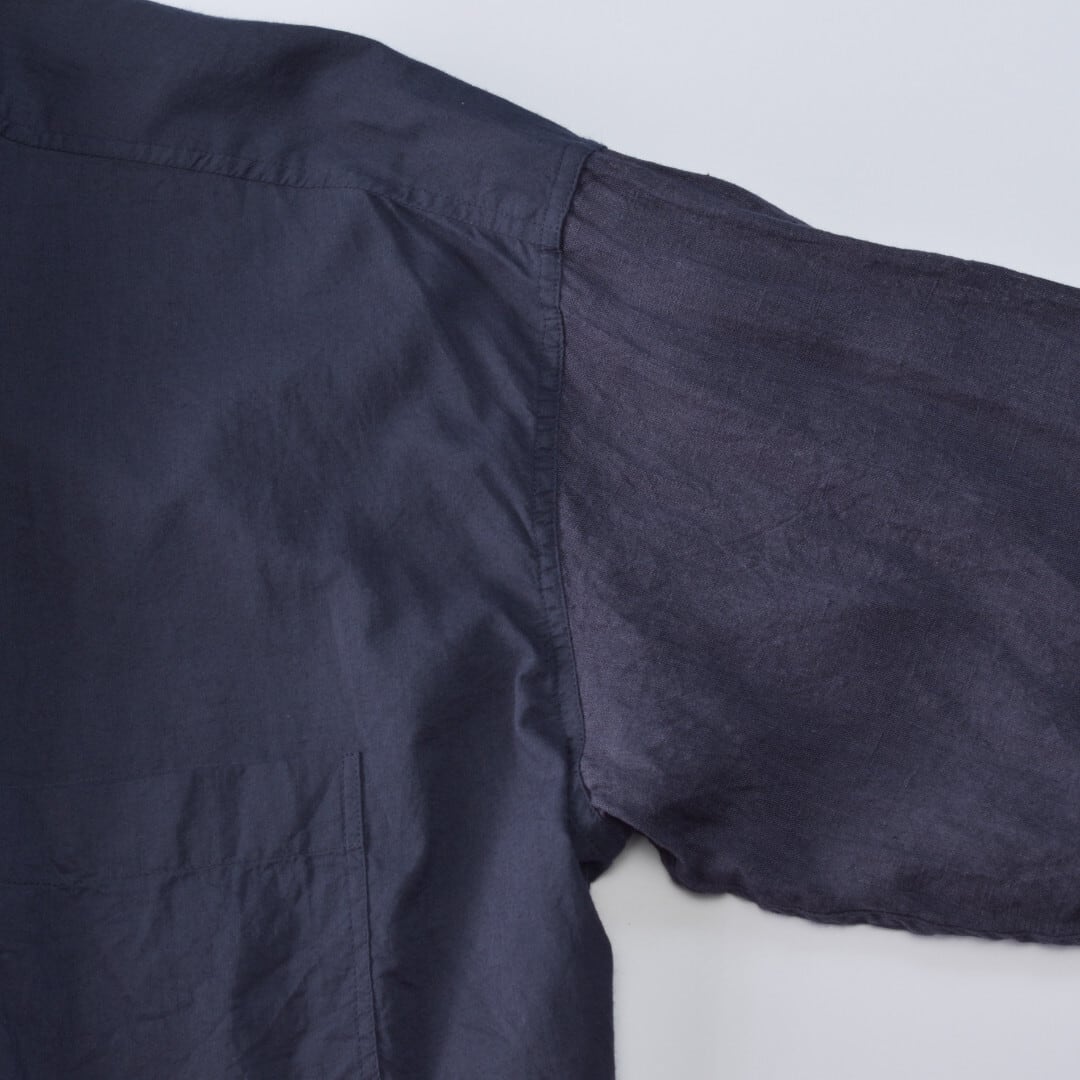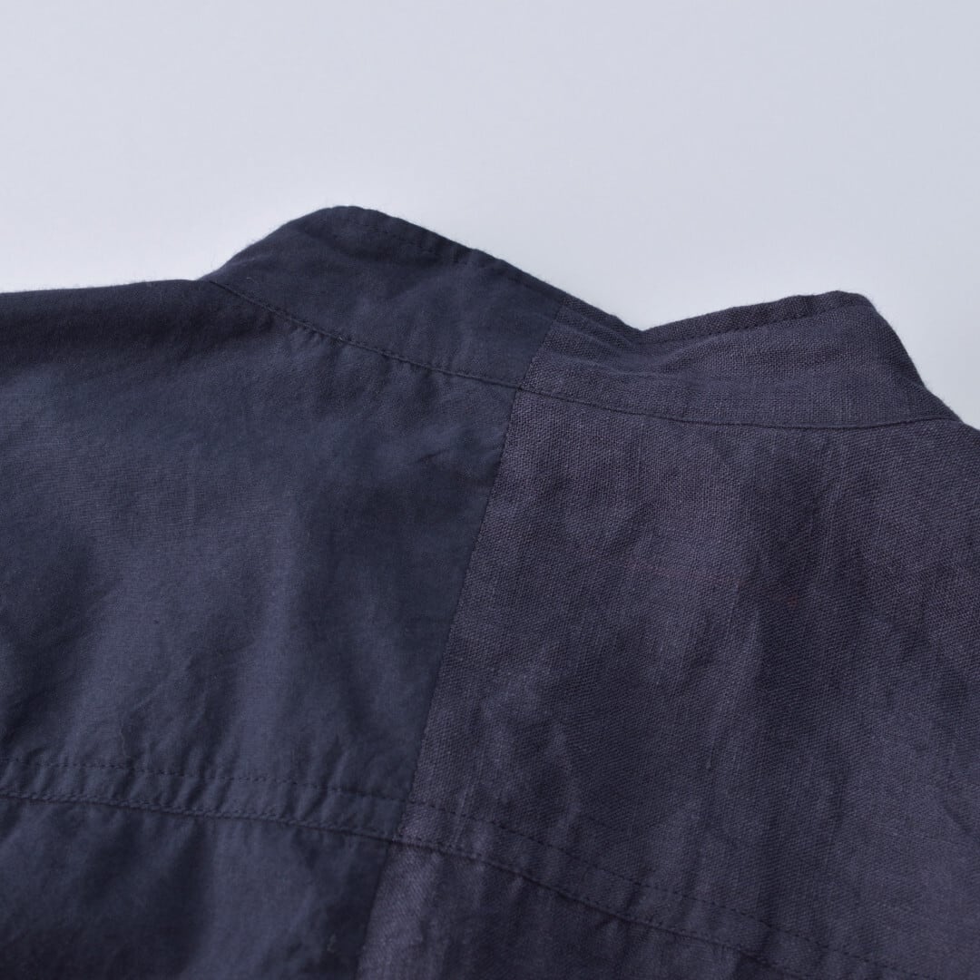 左右身頃とパーツごとで、リネンとコットン、それぞれ異なる素材を組み合わせたモードなデザイン。製品染め加工を施すことでシーム部分にパッカリングが生じ、ユーズド感のある仕上がりとなっています。また、素材が違うことにより、染め上がりの色の出方が異なり、微配色になっているのも特徴的です。襟は、顔まわりがすっきりと見えるバンドカラー。