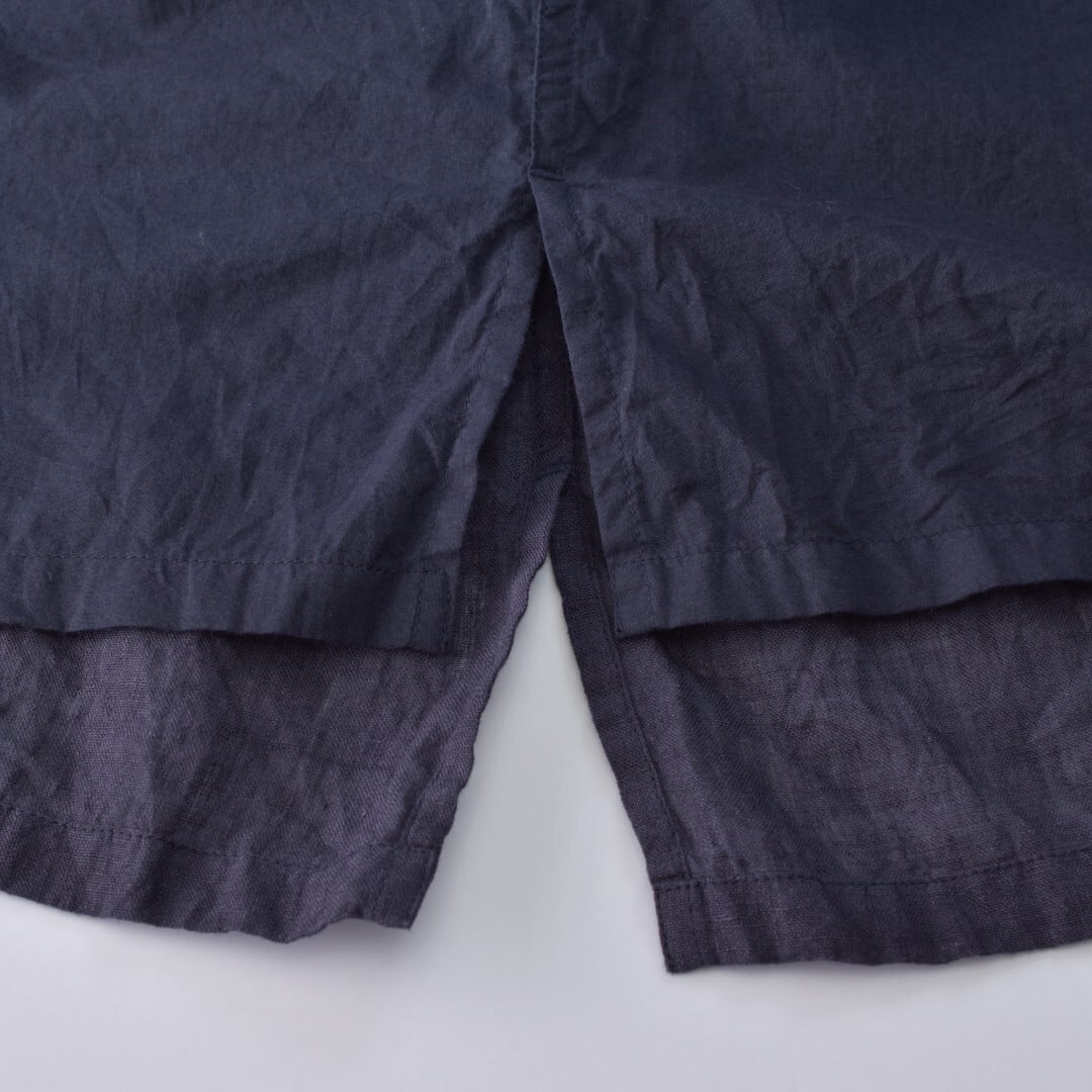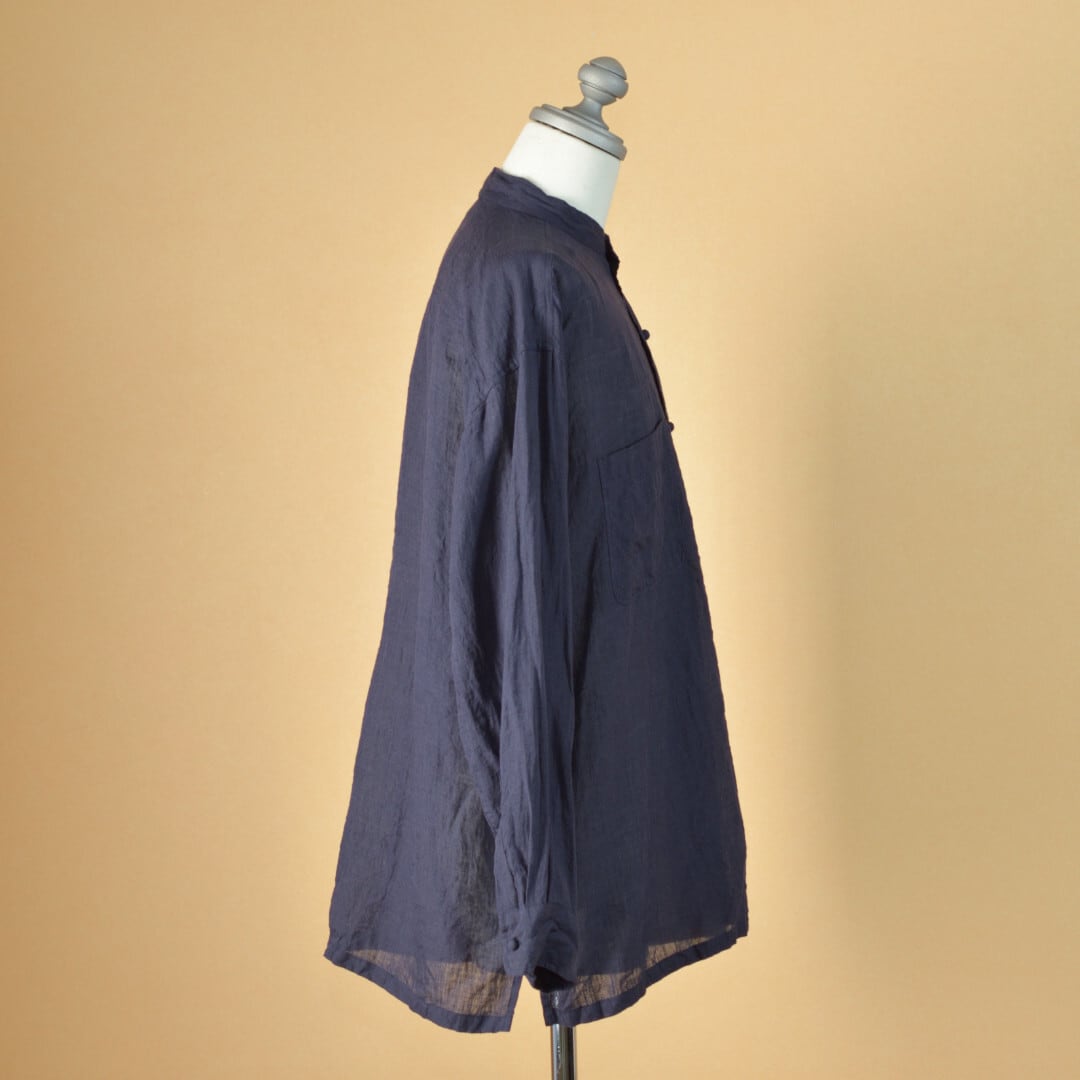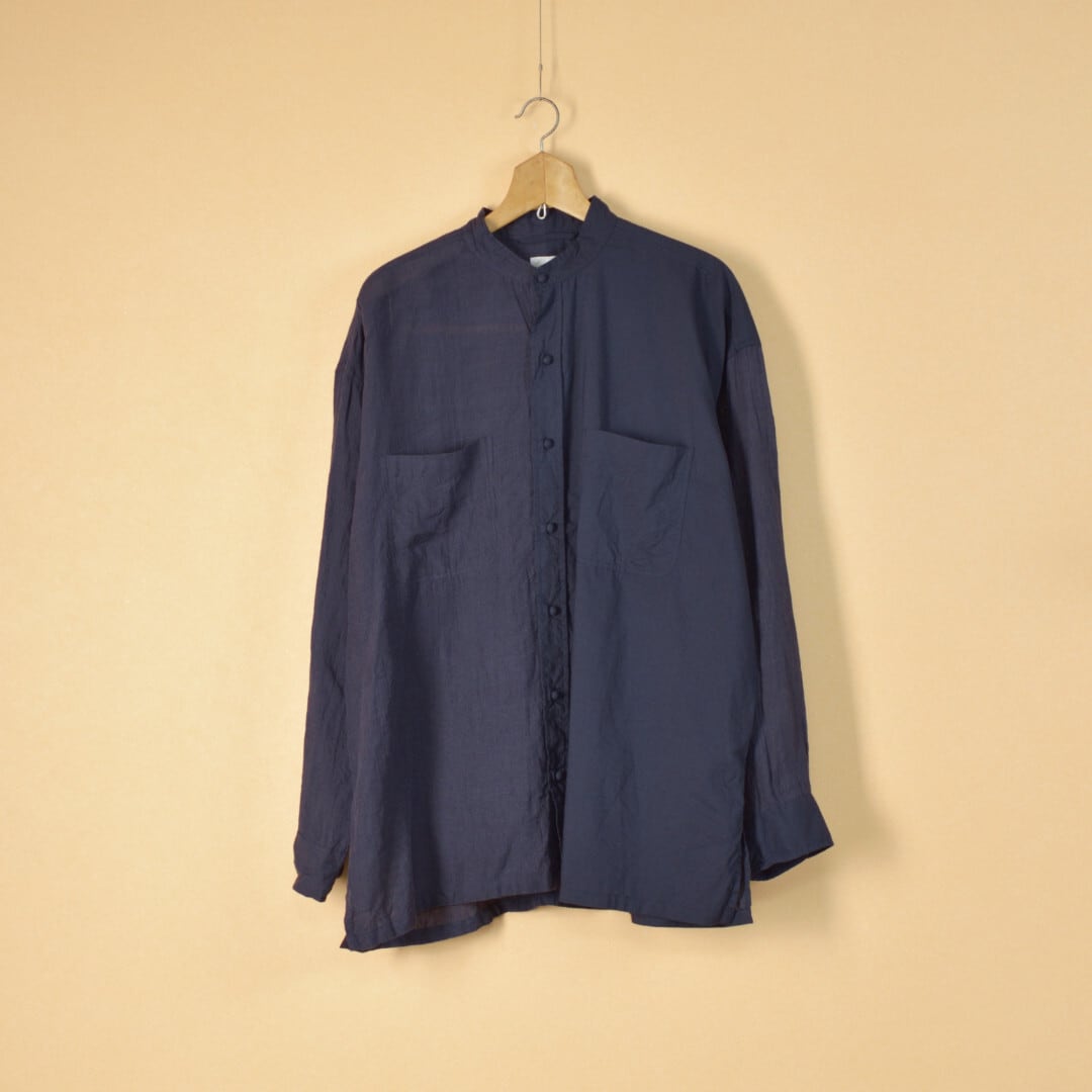 左右身頃とパーツごとで、リネンとコットン、それぞれ異なる素材を組み合わせたモードなデザイン。製品染め加工を施すことでシーム部分にパッカリングが生じ、ユーズド感のある仕上がりとなっています。また、素材が違うことにより、染め上がりの色の出方が異なり、微配色になっているのも特徴的です。襟は、顔まわりがすっきりと見えるバンドカラー。
