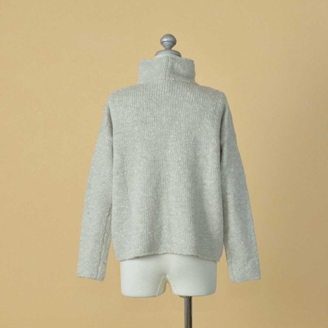 【商品詳細】撚りをかける前のウールにネップのあるシルクの糸を埋め込むように撚り合わせた糸で編んでいます。異なる色を組み合わせた独特な配色とその表情は、シンプルなアイテムもコーディネートのアクセントに。