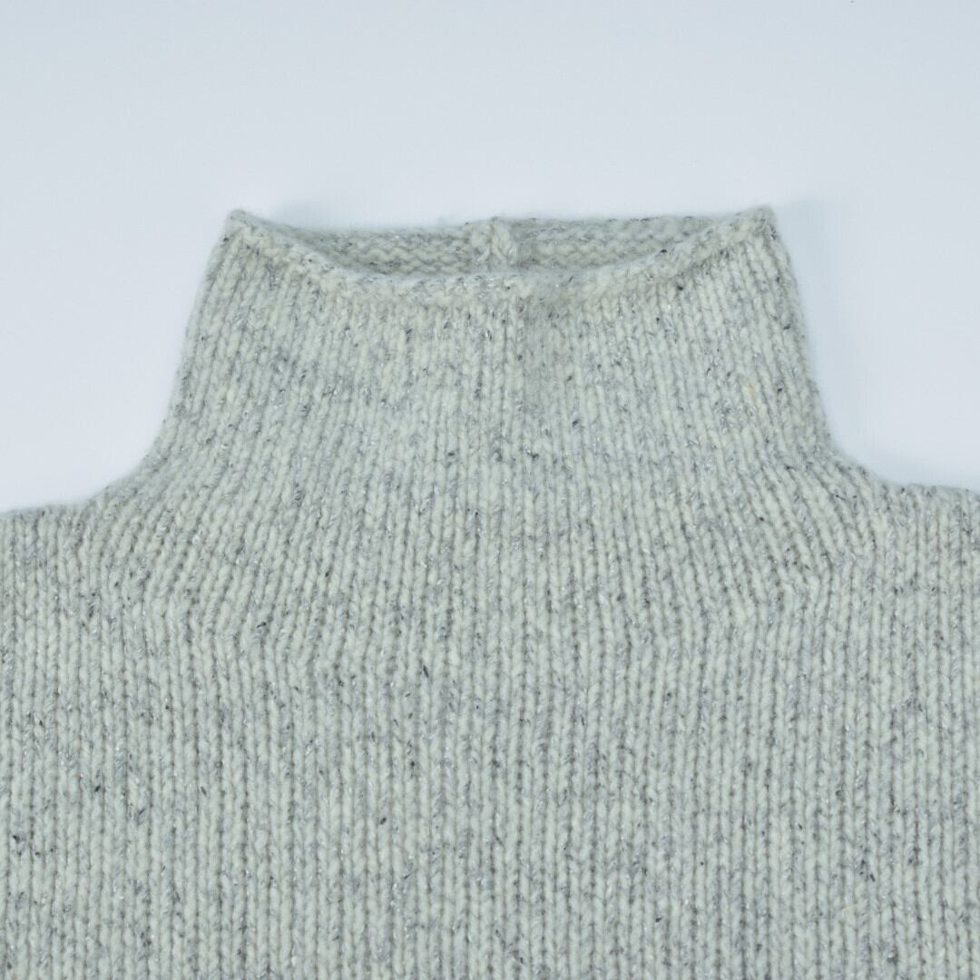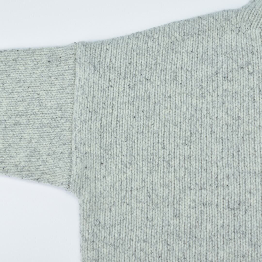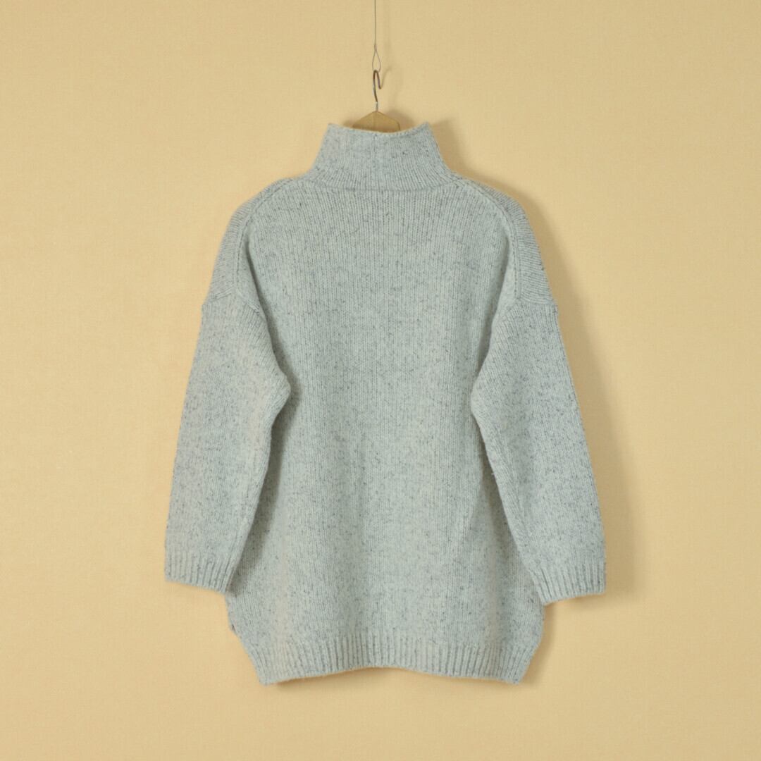 【商品詳細】撚りをかける前のウールにネップのあるシルクの糸を埋め込むように撚り合わせた糸で編んでいます。異なる色を組み合わせた独特な配色とその表情は、シンプルなアイテムもコーディネートのアクセントに。お尻が隠れるほどの丈感でゆったりと着ていただけます。
