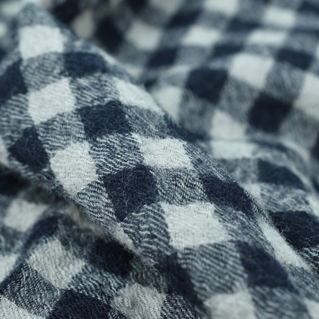【商品詳細】「POWER LOOM」と呼ばれる手織り機にモーターを取り付けた織り機で編み立てられた100%ウール素材のギンガムチェック生地を使用。