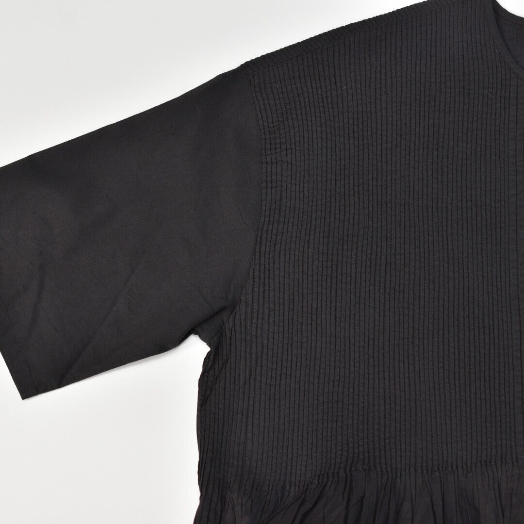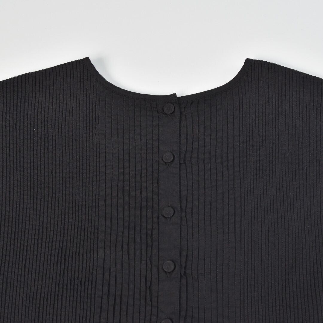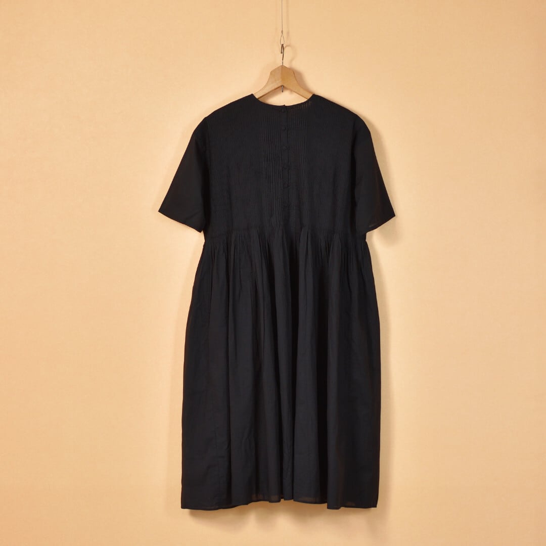 こちらは、前後身頃に肩から続く無数のピンタックが施されたクルーネック半袖ドレス
