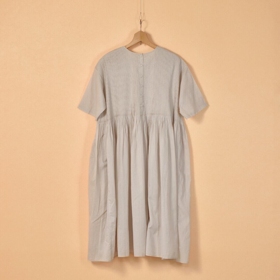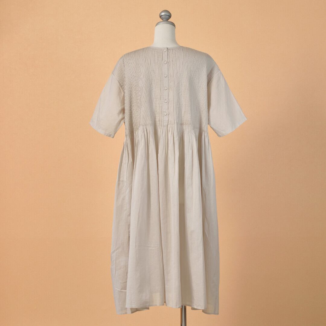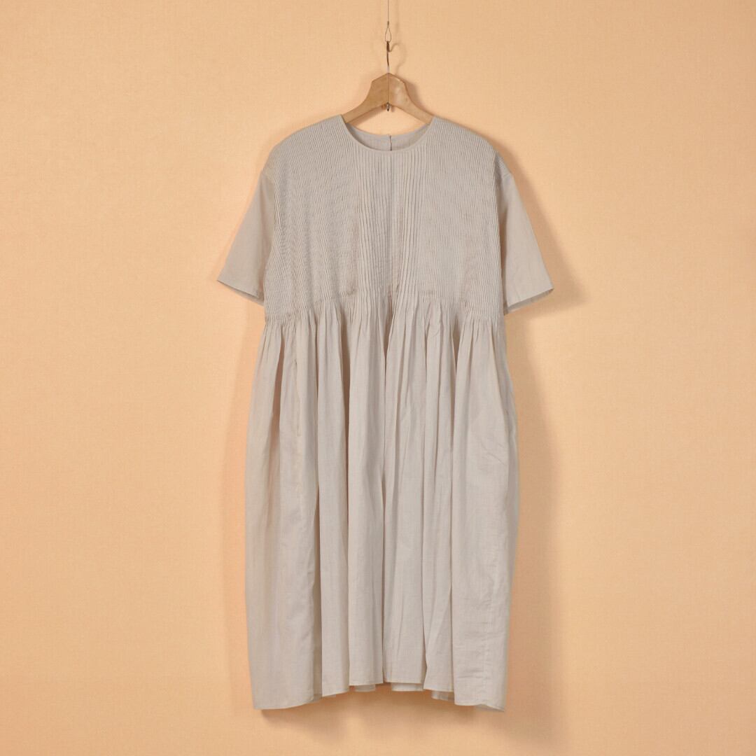 こちらは、前後身頃に肩から続く無数のピンタックが施されたクルーネック半袖ドレス