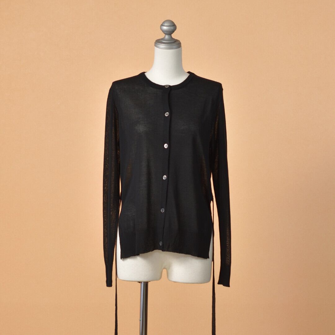 【商品詳細】ハイゲージの強撚糸を使った透け感の有る軽やかなカーディガンです。レイヤーコーデにしても重たさを感じさせないカーディガンです。サイドのリボンがデザインのアクセントに!