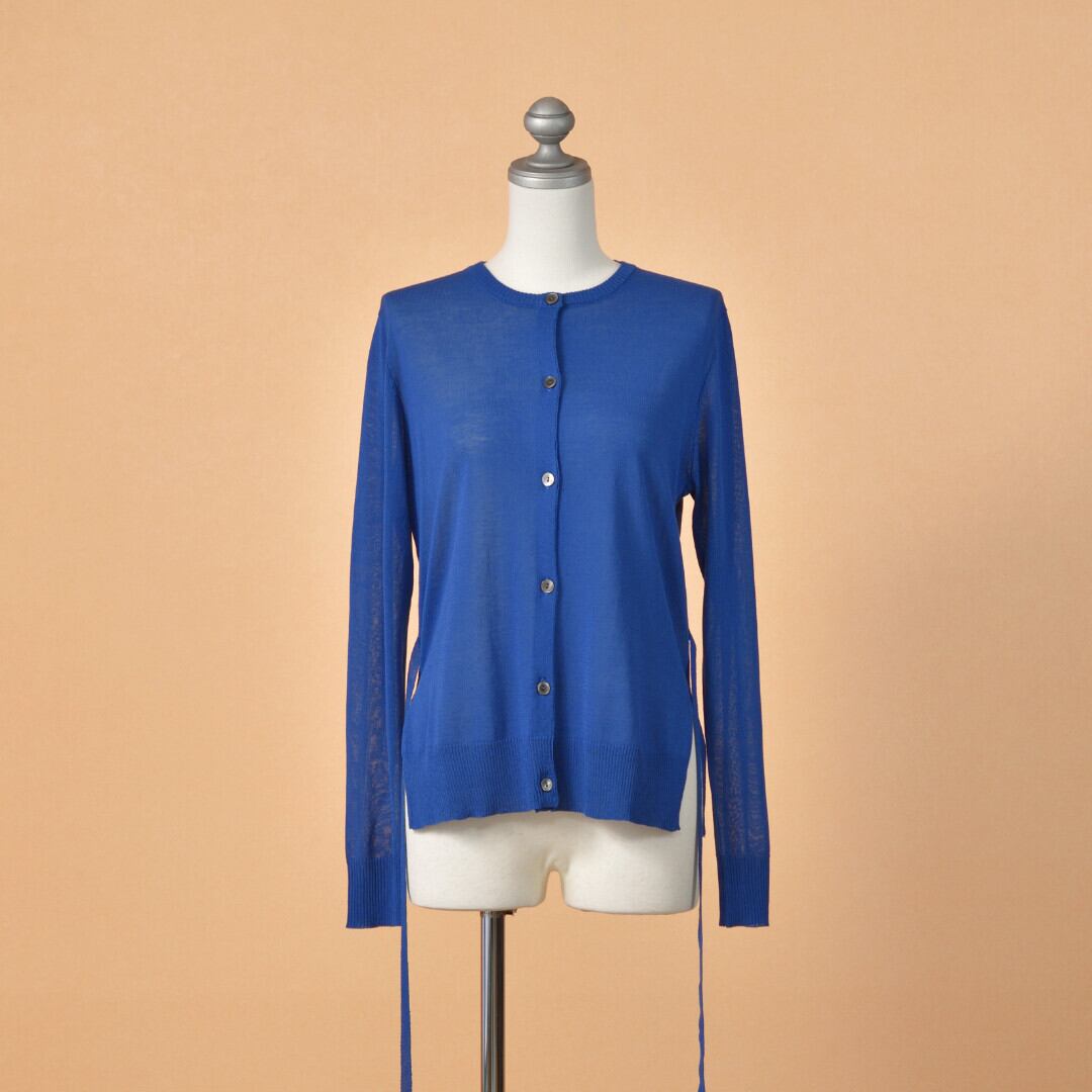 【商品詳細】ハイゲージの強撚糸を使った透け感の有る軽やかなカーディガンです。レイヤーコーデにしても重たさを感じさせないカーディガンです。サイドのリボンがデザインのアクセントに!