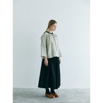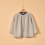 【商品詳細】このリネン製のブラウスは、肩と襟元にたっぷりとギャザーを寄せたデザインで、配色のリネンで仕立てた首元ところんとしたくるみボタンの連なるデザインが、古びたヨーロッパのアンティークを彷彿とさせる存在感を放ちながら、このブラウスに溶け込んでいます。