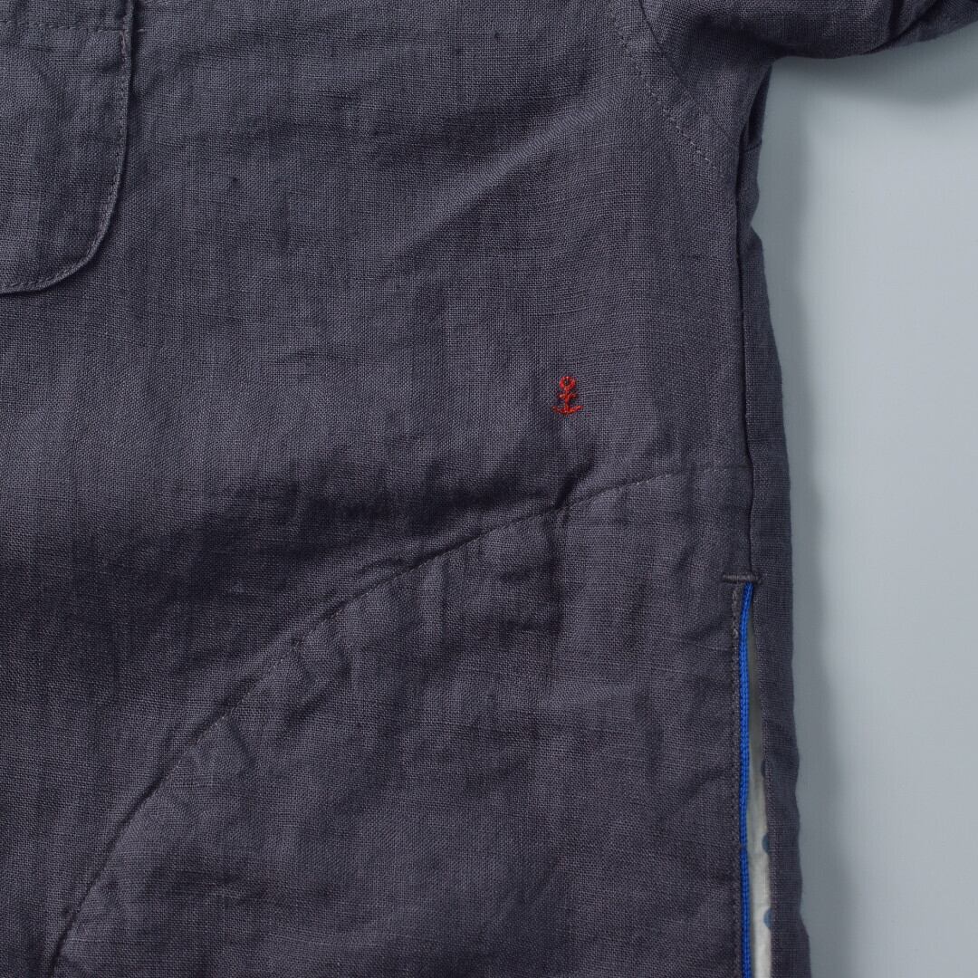 快晴堂らしいデザインがいたる所に散りばめられ、胸元のポケットや、碇印のボタン、左脇のアンカー刺繍、このシャツの個性を引き立てます。カジュアルなデニムスタイルから、きれいめなスカートスタイルまで、あらゆるコーディネートに合わせやすく、初夏から真夏まで活躍してくれる一着です。