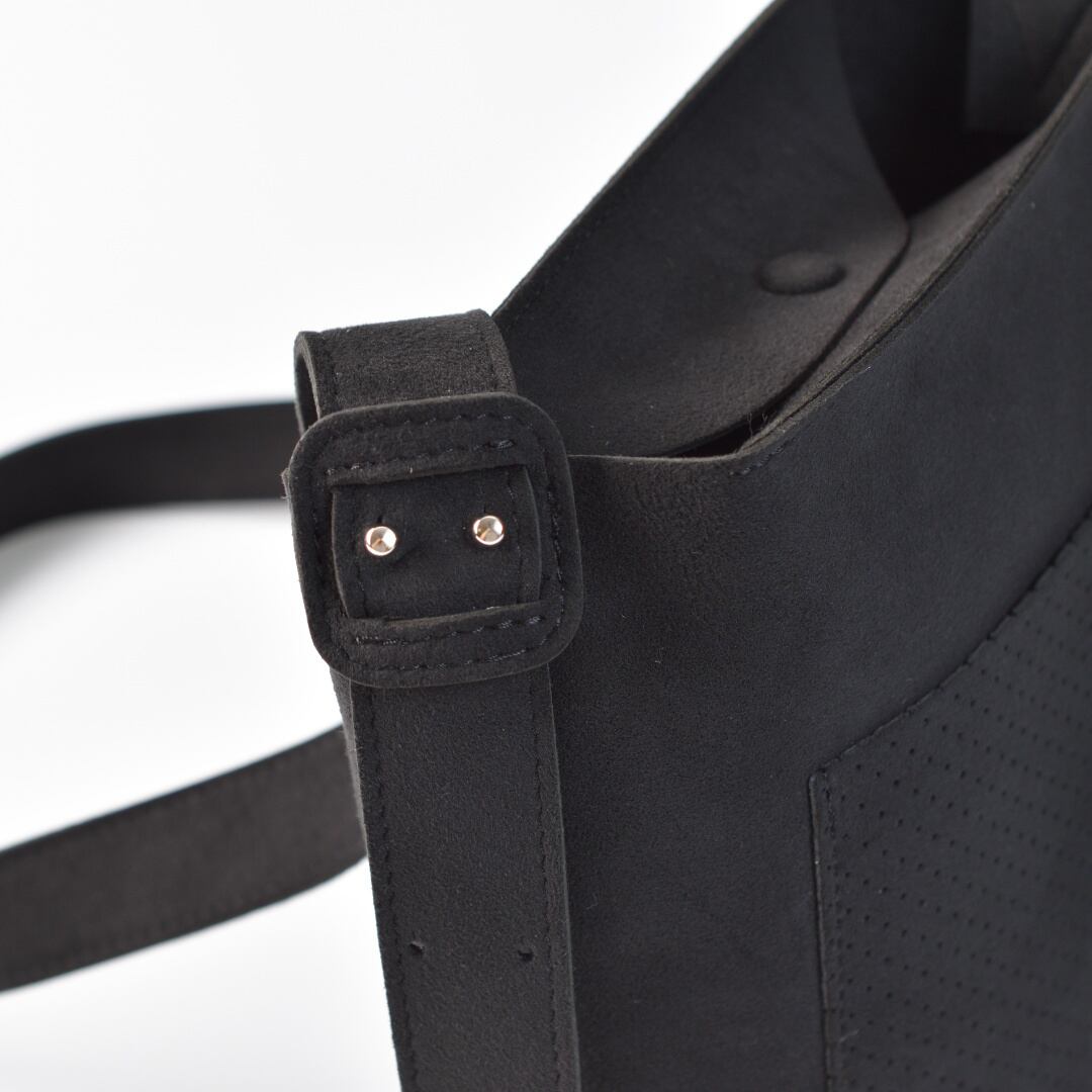 【商品詳細】マイクロファイバー『ウルトラスエード』を用いた、ワンハンドルスモールバケットショルダーです。ハンドルはギボシ金具で長さ調節が可能です。斜めがけでも使うことができます。開口部は2つの半円型のフラップで目隠しができます。前面にパンチング加工したポケットを施しています。150gというとても軽いバッグです。家庭洗濯が可能です。