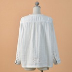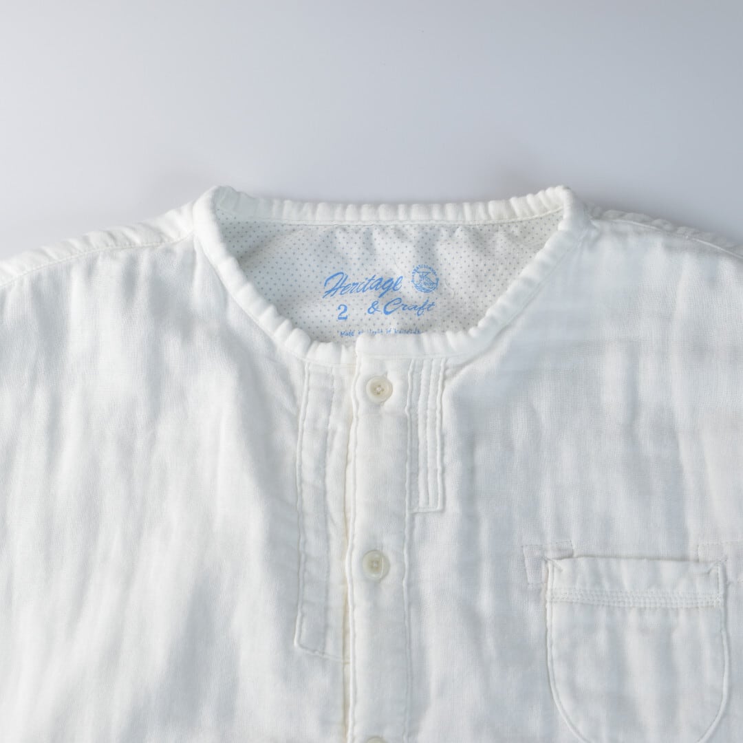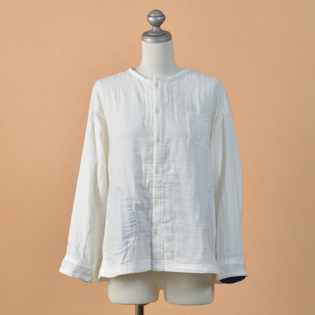 【商品詳細】ハンドメイド感あふれるワイドシャツです。左右の前身ごろのデザインがアシンメトリーとなっています。使われている生地はフワッとした厚みの有るトリプルガーゼが使われています。この生地も今回で最終ロットの為、今後の生産がございません。ドンドンと手間のかかる素材が使えなくなって寂しくなってしまいますね!