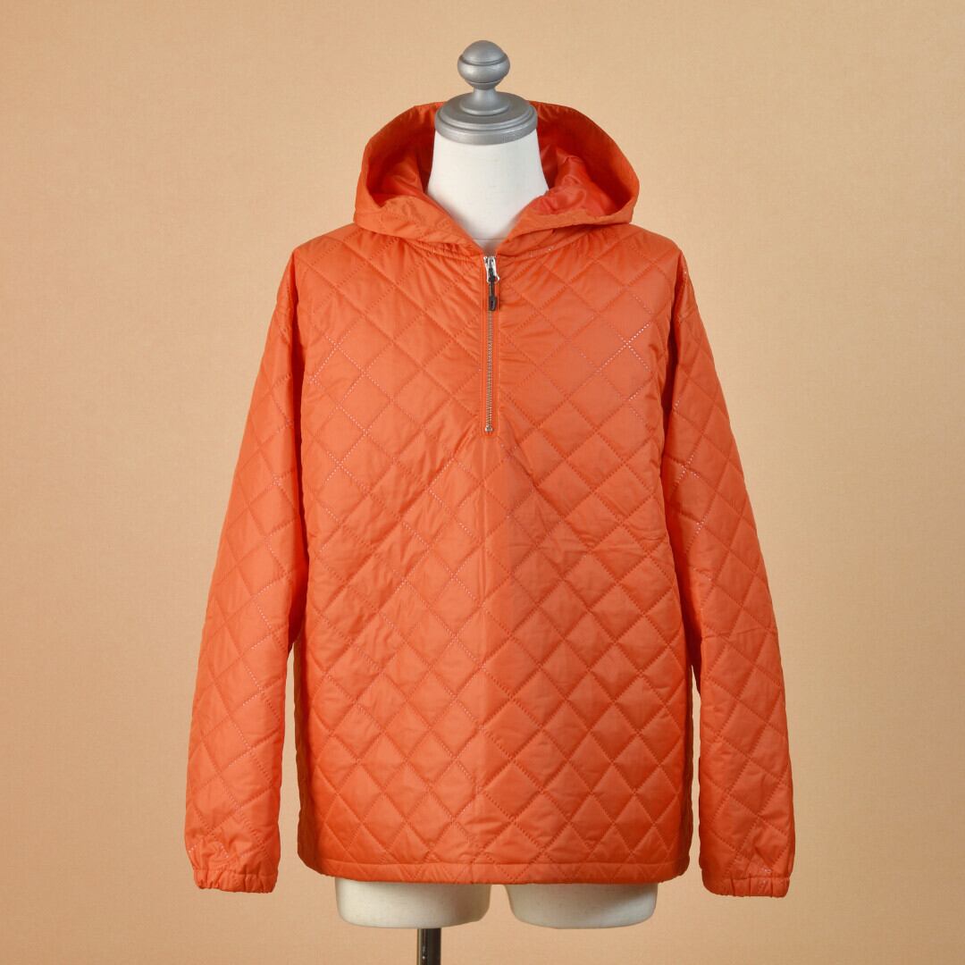 【商品詳細】ピンソニックキルト加工を施した高密度ナイロンを使った中綿ハーフジップパーカーです。アノラックの様にアウターとして、またスウェットパーカーの様に色々なアイテムと気軽にスタイリングして頂けます。裾口にはスピンドルが内臓されていますのでブラウジングで調整して頂けます。スリーブは2枚袖で肘にタックを入れて運動量を稼いでいます。素材は撥水加工が施されたナイロンタフタに、30gの薄い中綿シートをヒーテッドキルト加工を施しています。柔らかく軽いキルティング生地が特徴です。