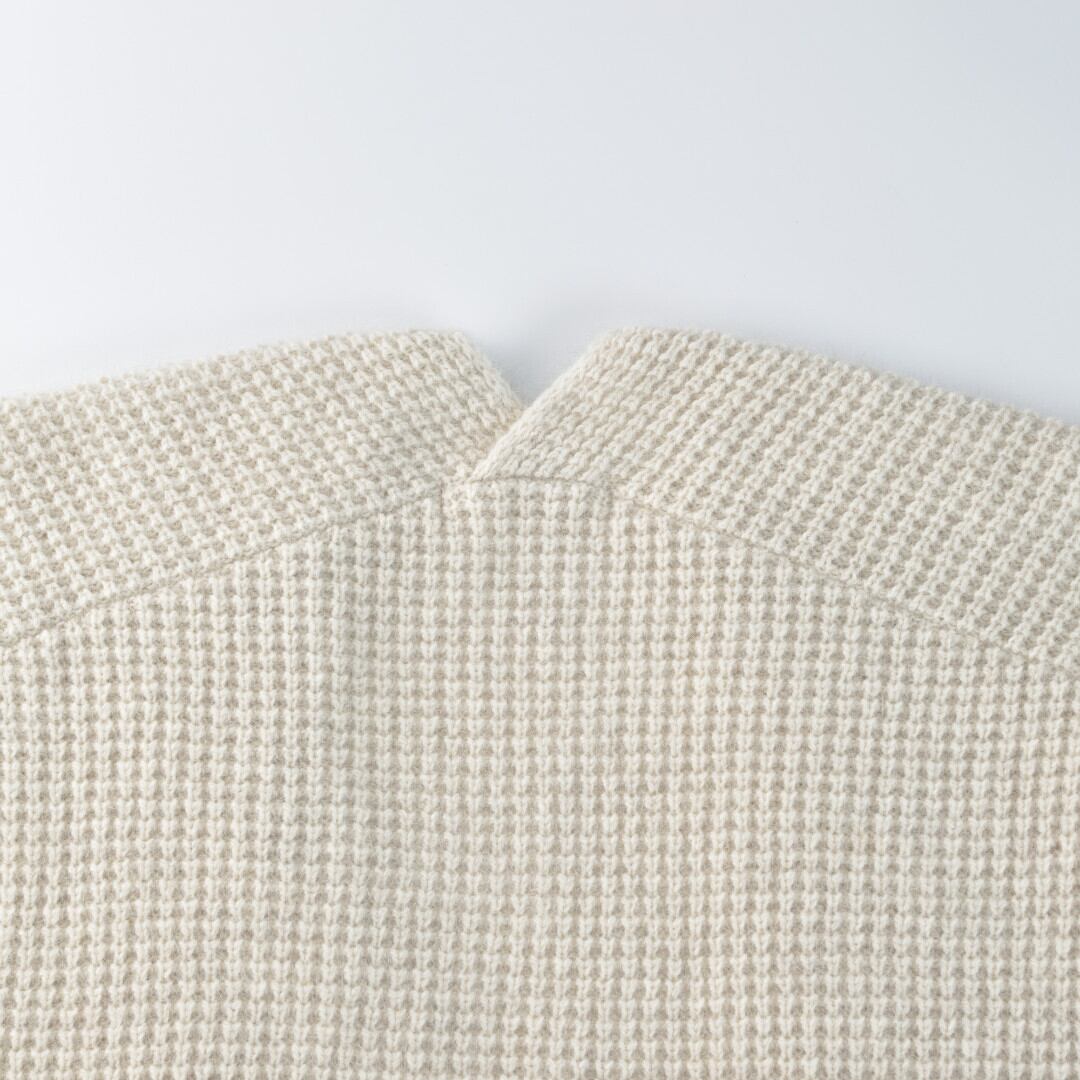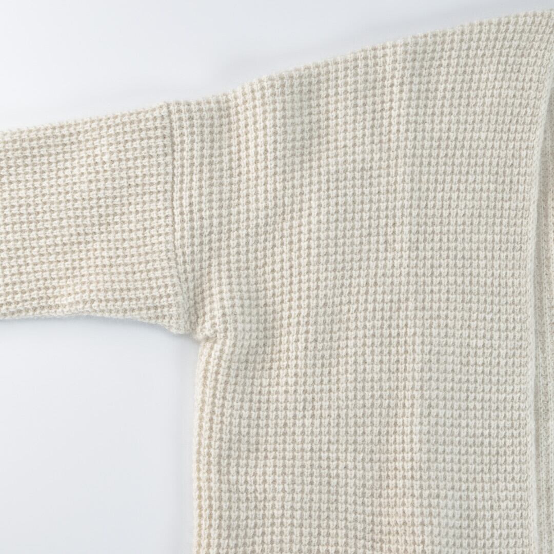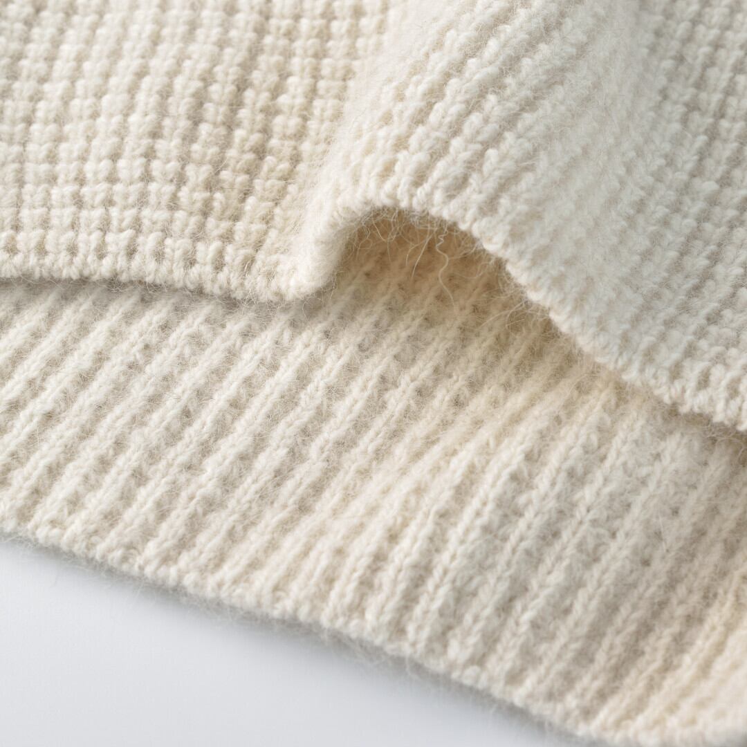 【商品詳細】弾力のあるメリノウールと、ふんわりとした毛がしなやかでやさしいブルーフォックスをブレンドしたニット。数色の綿を混ぜ合わせて染色をしているため、ナチュラルで味わい深い色合いに。ふわりと軽やかな着心地ながら嵩高く、カシミヤやウールと並ぶほどの保温性をもちます。ふくらみのある特性を生かして、特徴的な畦編みで編み立たローブ。厚みがあるので、少し肌寒い時季にはコート代わりに。