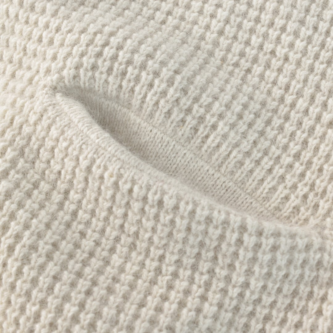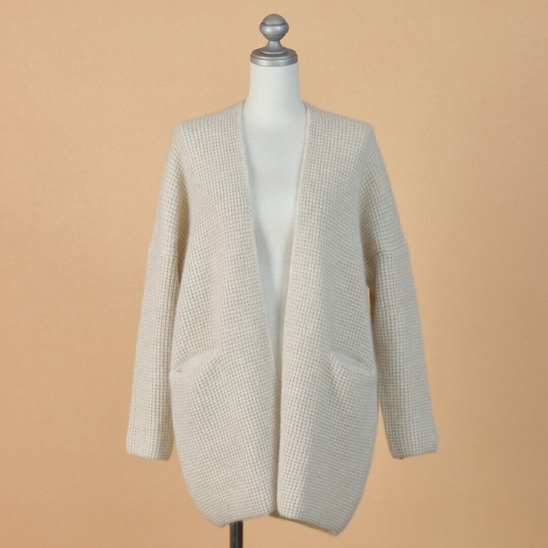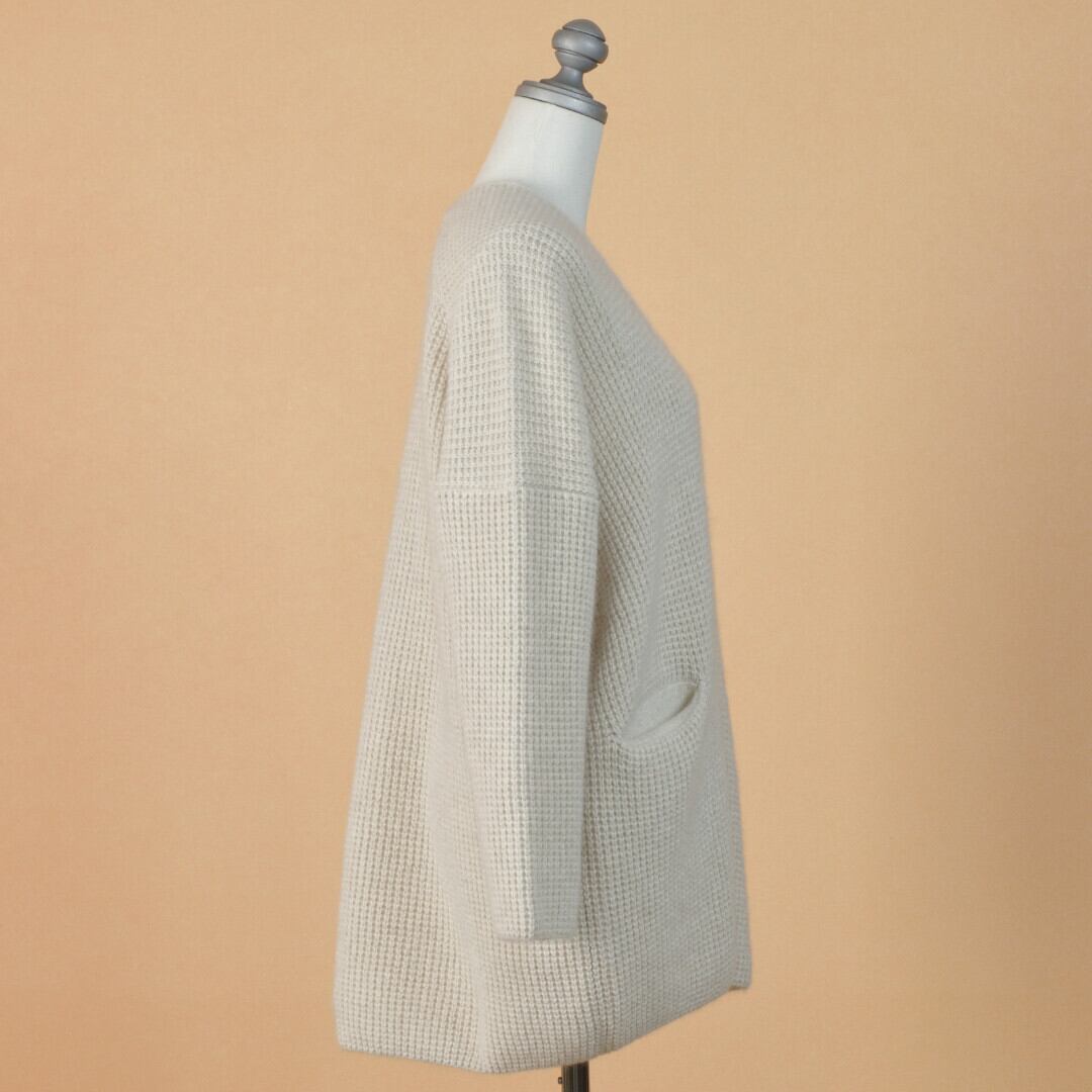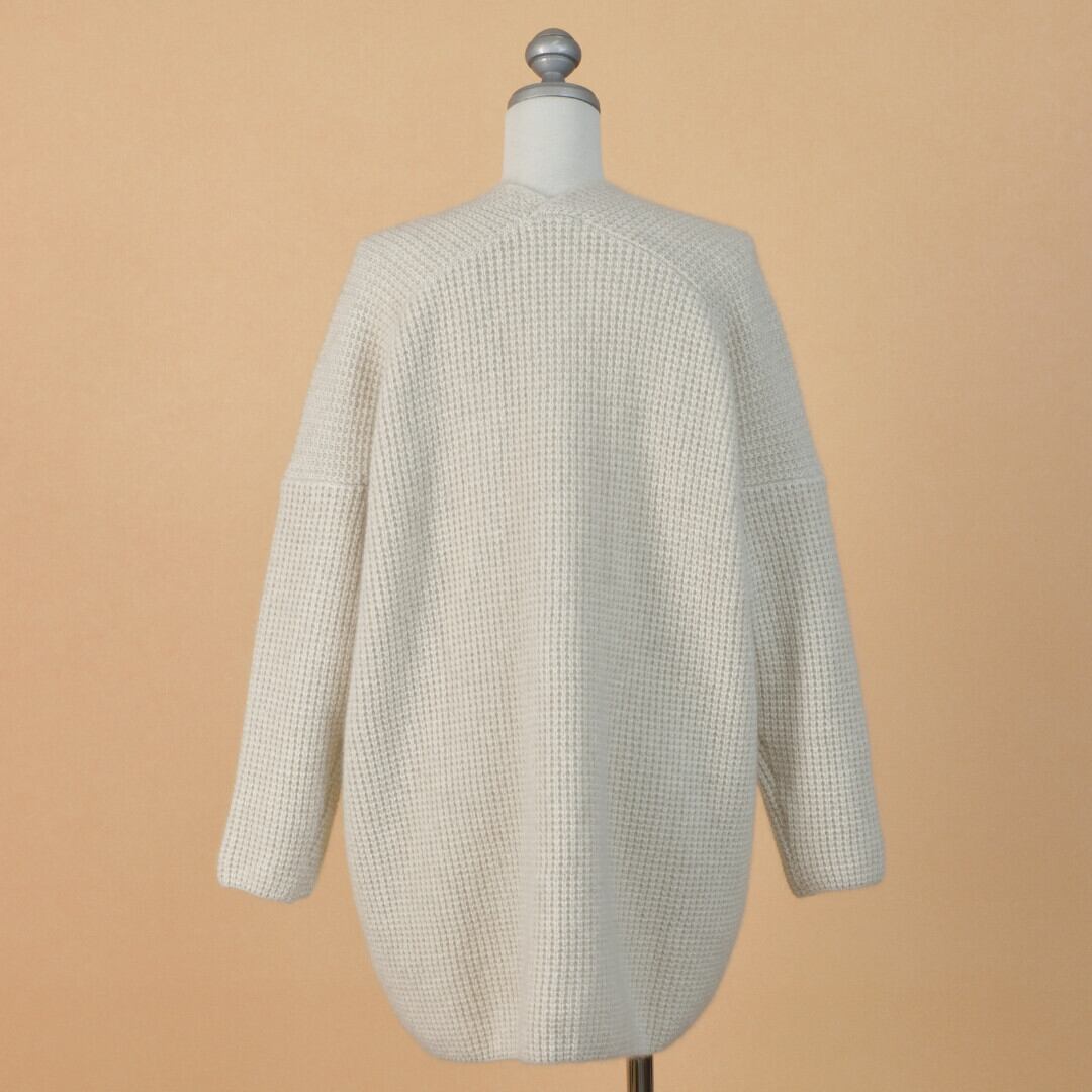 【商品詳細】弾力のあるメリノウールと、ふんわりとした毛がしなやかでやさしいブルーフォックスをブレンドしたニット。数色の綿を混ぜ合わせて染色をしているため、ナチュラルで味わい深い色合いに。ふわりと軽やかな着心地ながら嵩高く、カシミヤやウールと並ぶほどの保温性をもちます。ふくらみのある特性を生かして、特徴的な畦編みで編み立たローブ。厚みがあるので、少し肌寒い時季にはコート代わりに。
