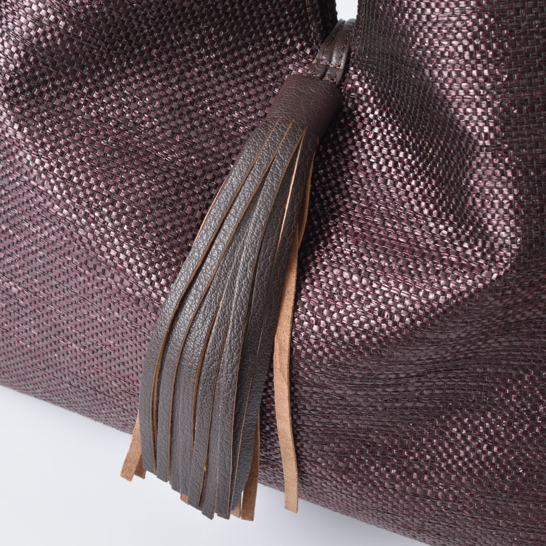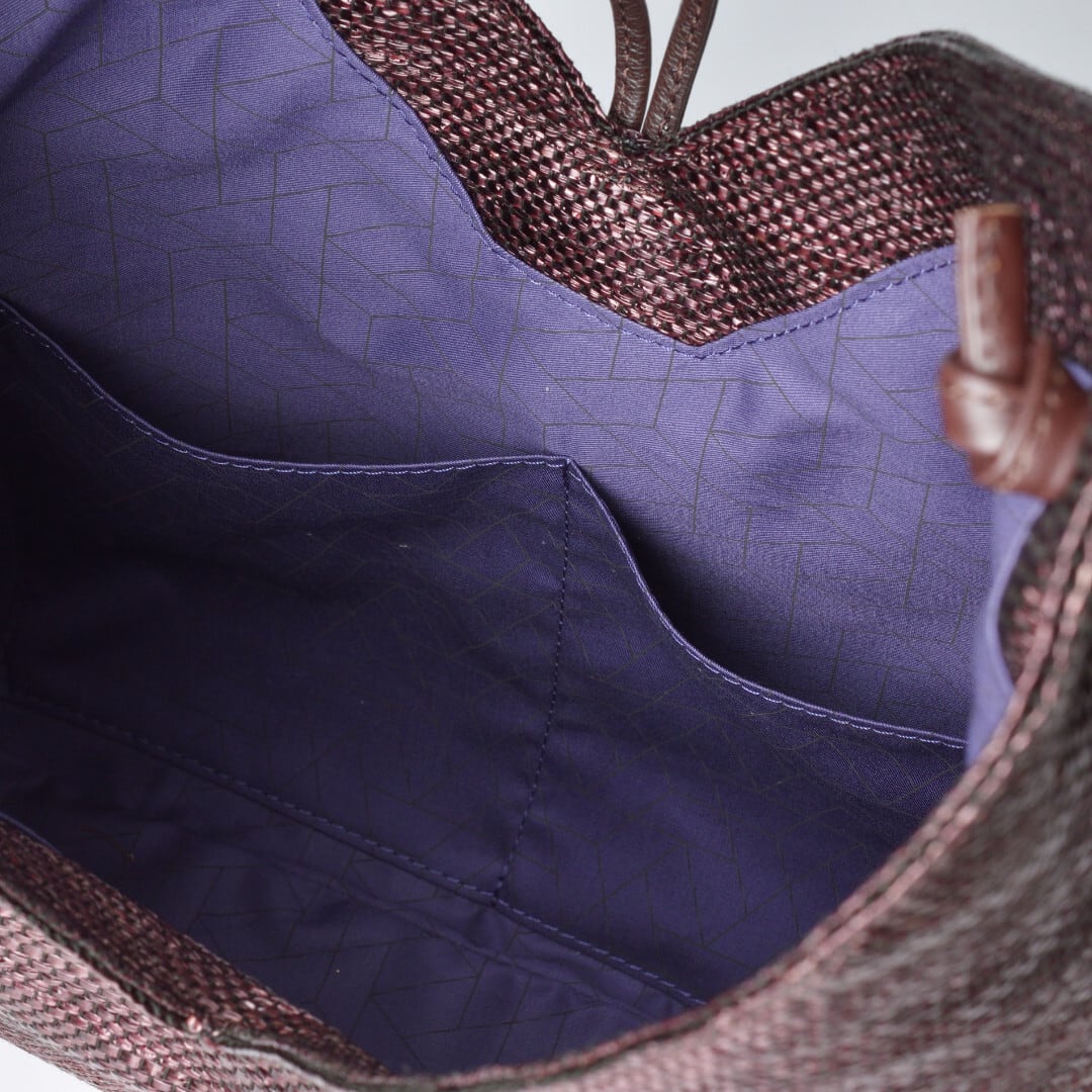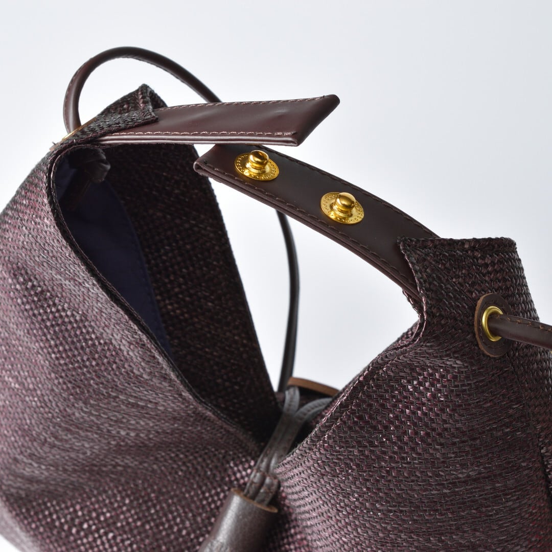 【商品詳細】油分を多く含んで耐久性に優れたパナマ繊維をシート状に織った素材を使った贅沢なバッグです。スナップボタン付きのハンドルを使って手持ち、肩がけと使い分けていただけます。また、付属のサイズ調整が可能なストラップでショルダーバッグとしてもお使いいただけます。