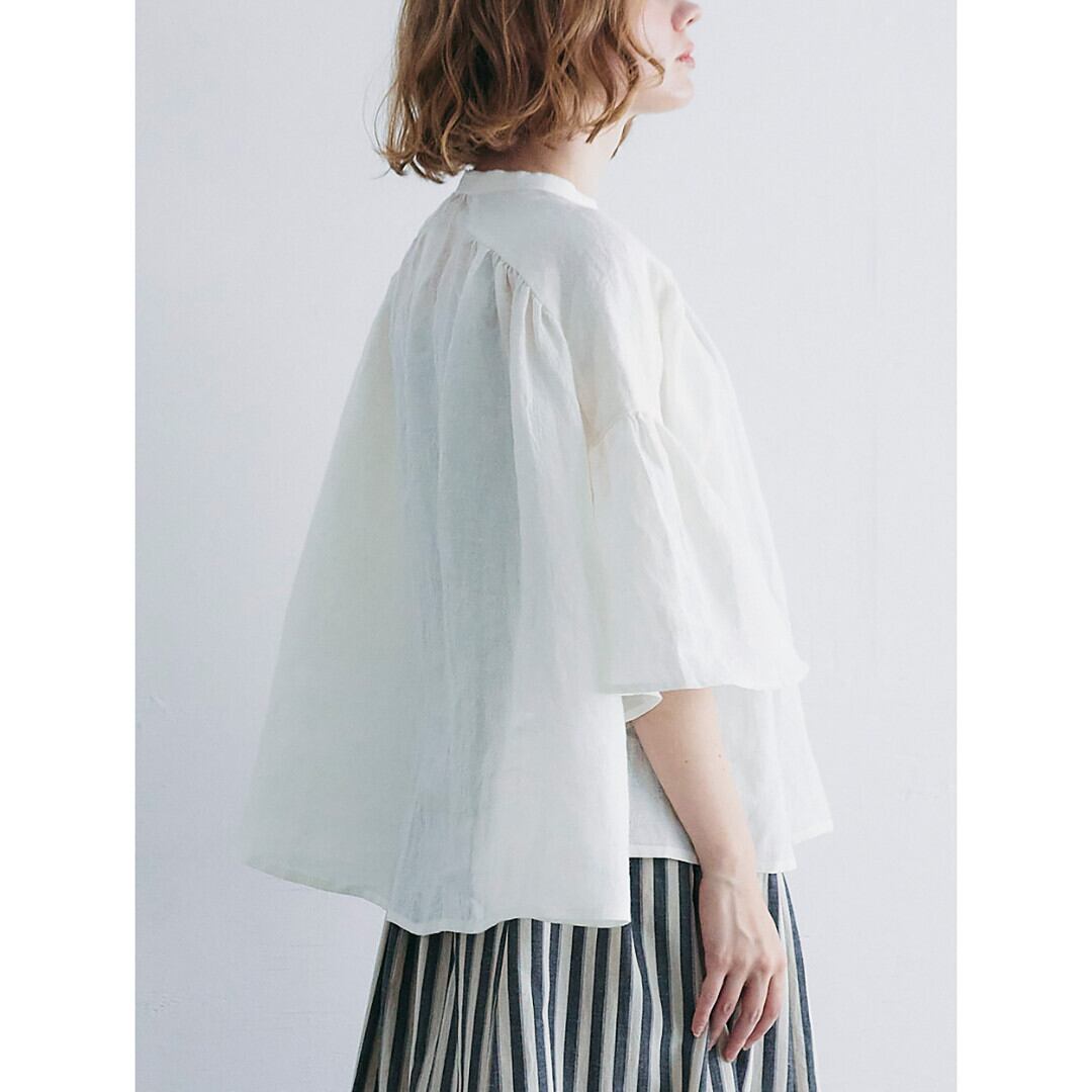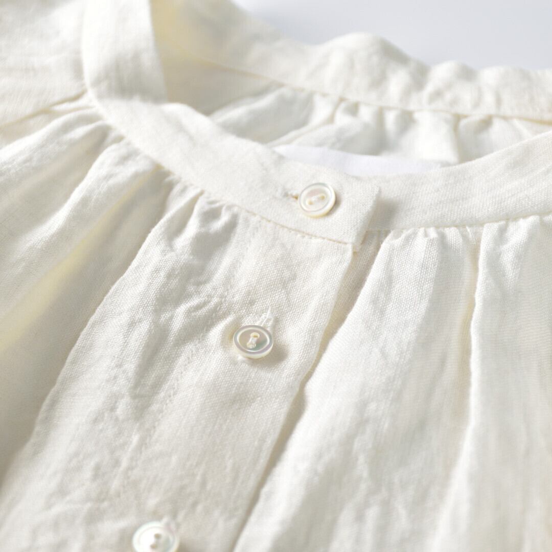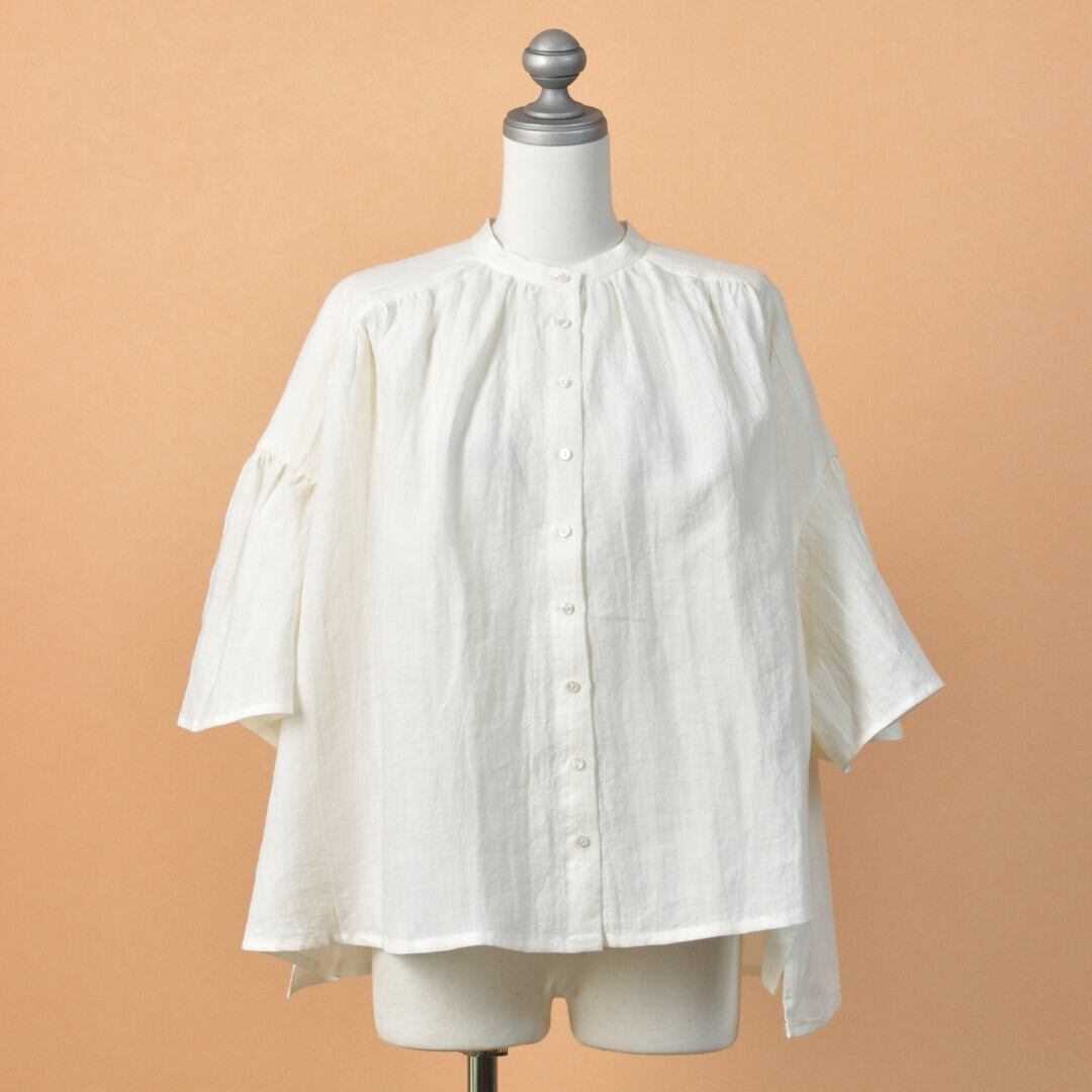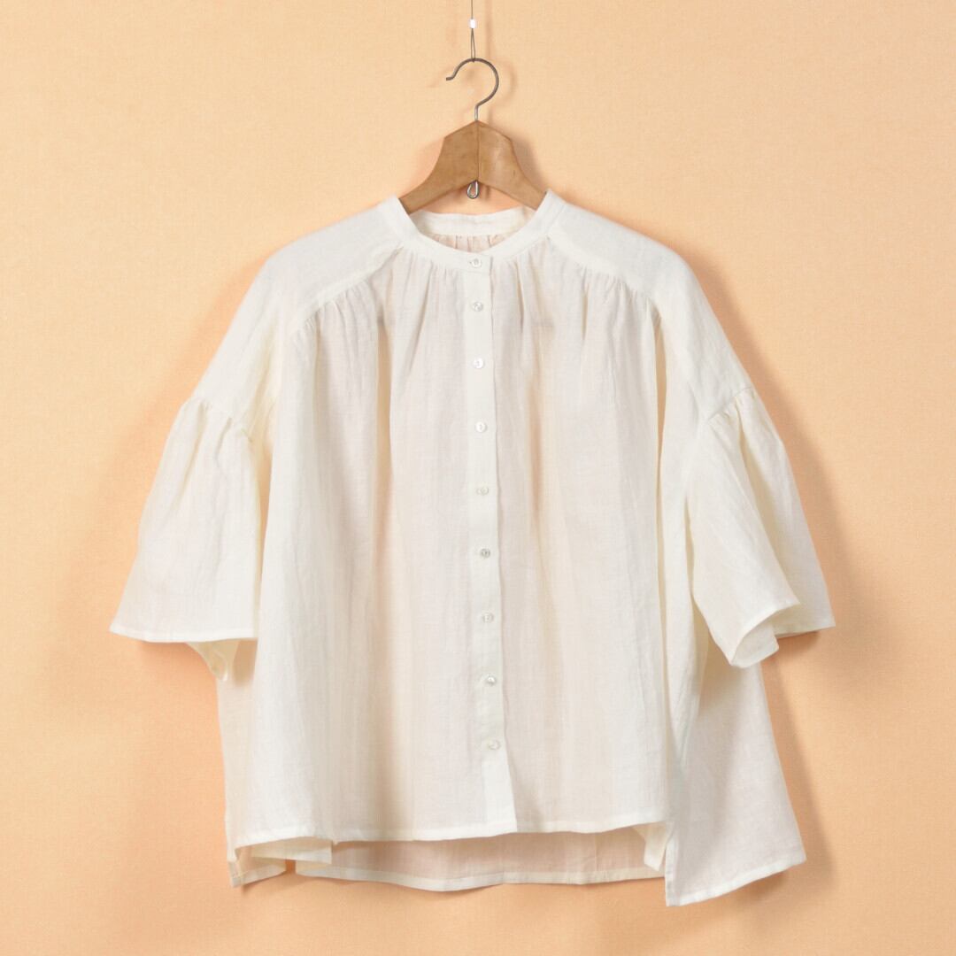 衿ぐりから肩ヨークにかけてギャザーを入れ、 分量感を持たせることで、軽やかな麻の流動感が美しいブラウスになっています。