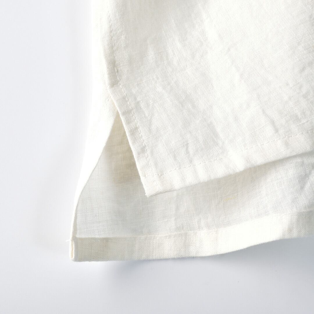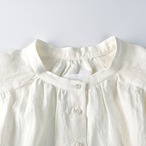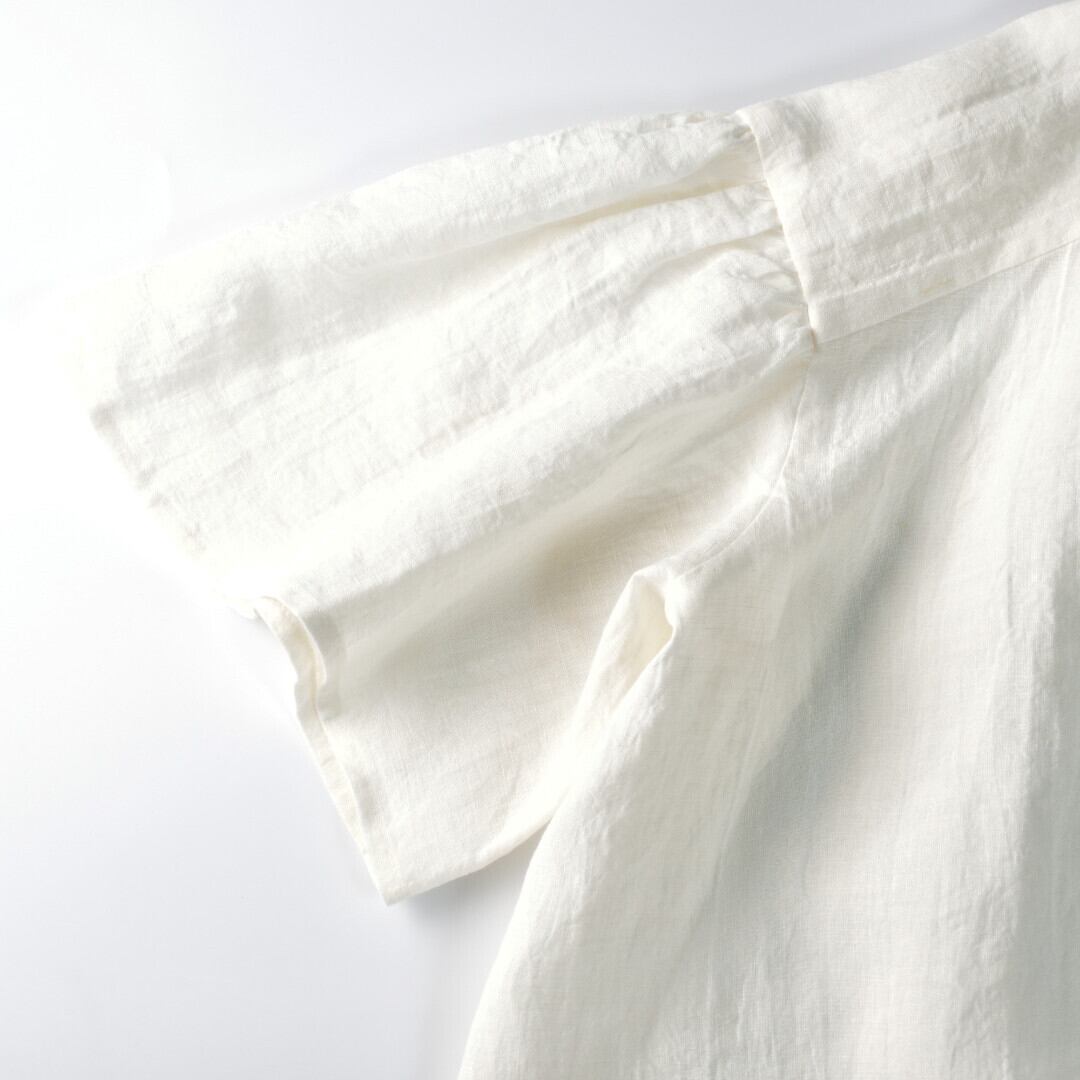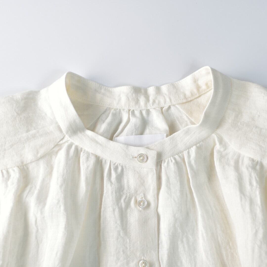 衿ぐりから肩ヨークにかけてギャザーを入れ、 分量感を持たせることで、軽やかな麻の流動感が美しいブラウスになっています。