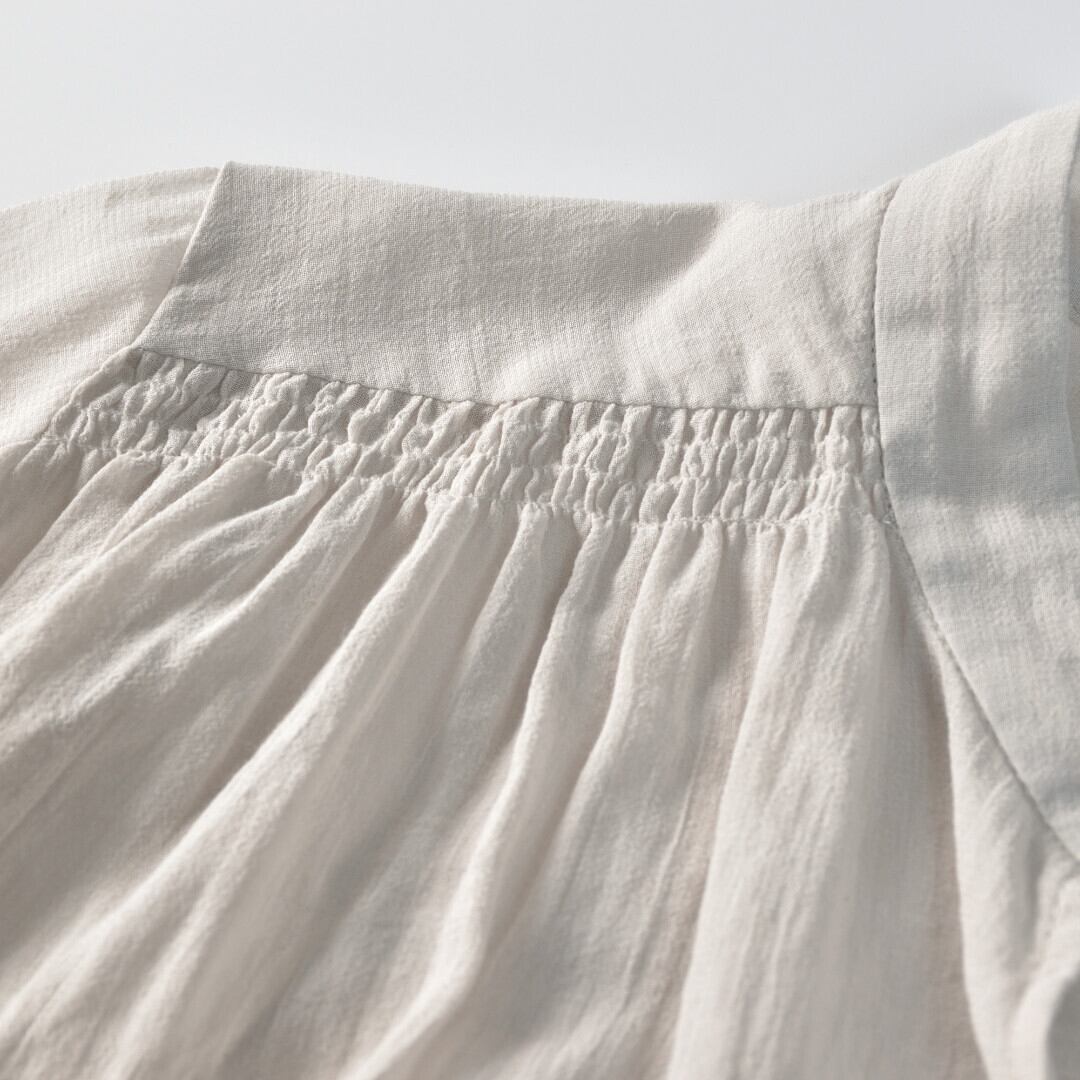 【商品詳細】エヴァムエヴァのギャザープルオーバーは、シンプルながらも上品で優雅な印象を与える一枚です。コットンとシルクを組み合わせたシフォンジョーゼット生地は、肌触りがとても柔らかく、軽やかな着心地を実現しています。肩と背中に施したシャーリングから生まれるギャザーが、ふわりと広がり、動くたびに品のあるシルエットを演出します。