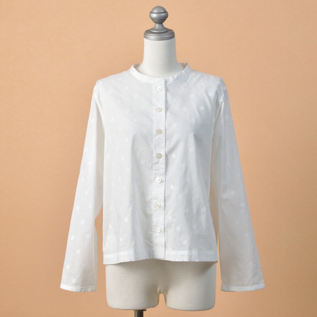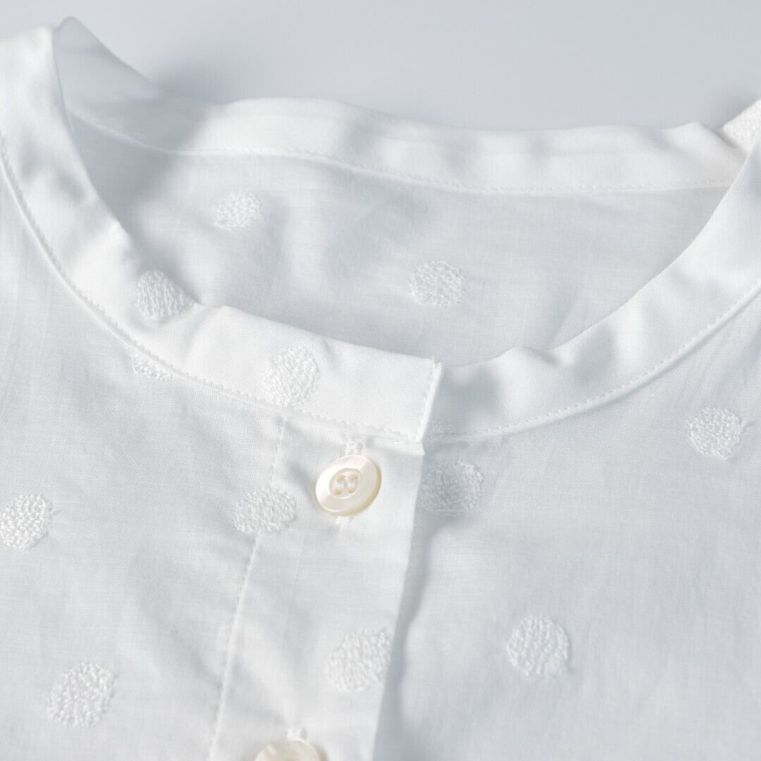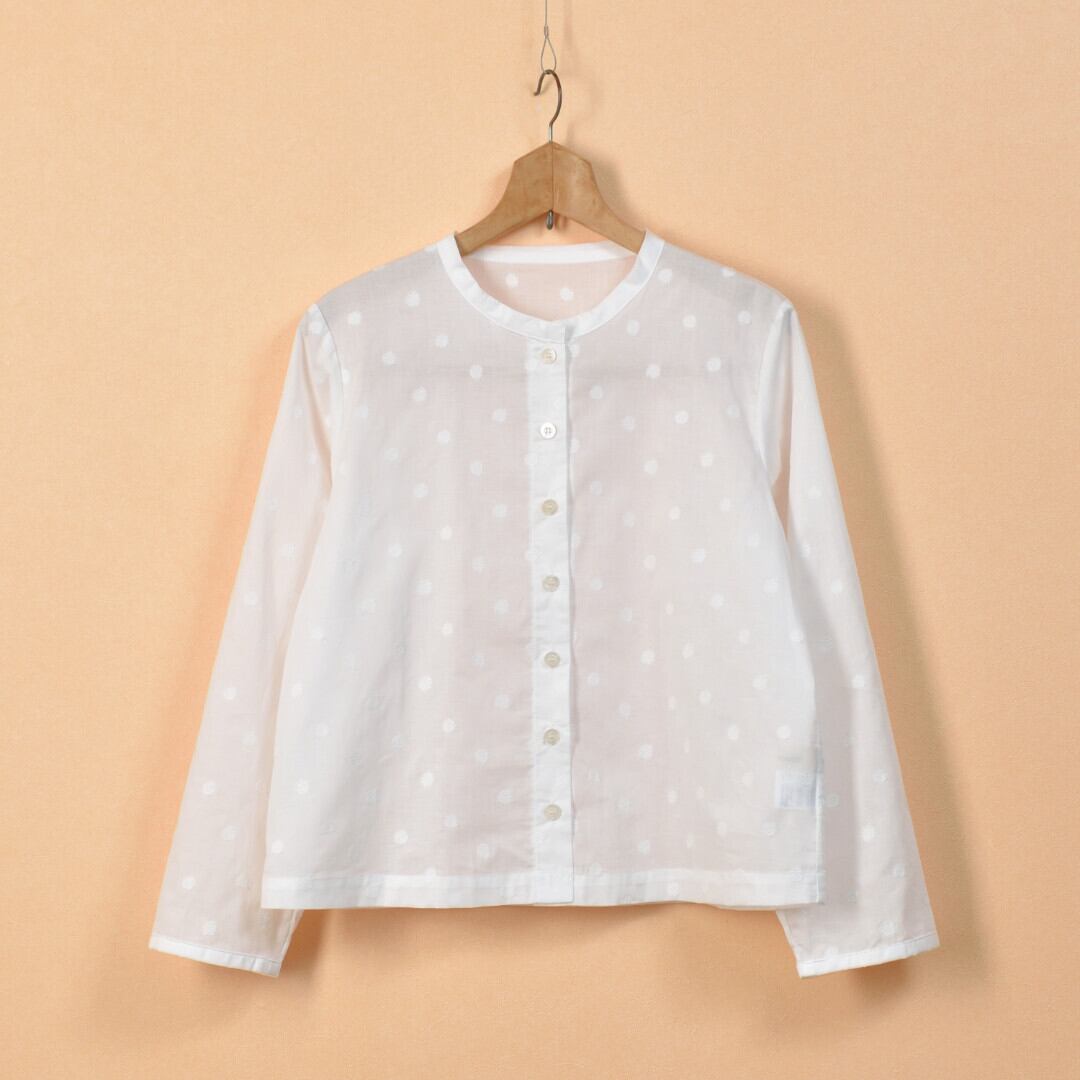 【商品詳細】軽くて薄手のコットンに水玉模様の刺繍が施されたノスタルジックな雰囲気のシャツカーディガン。真夏の冷房対策や日ざし避けにも重宝する長袖の羽織りです。
