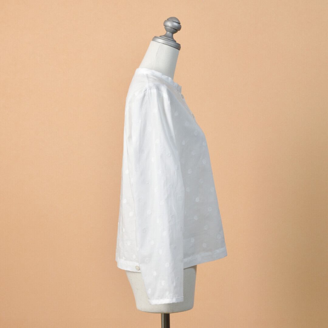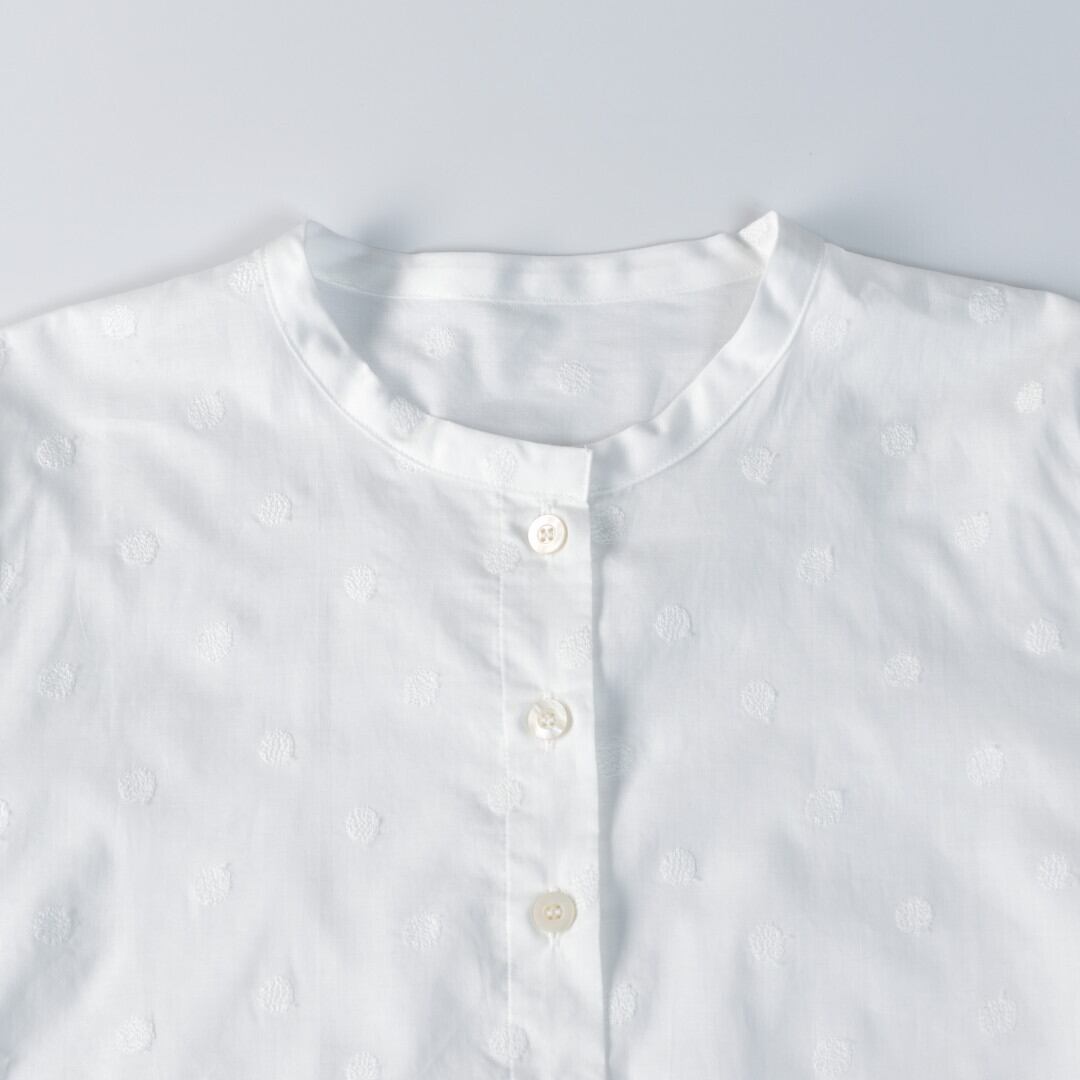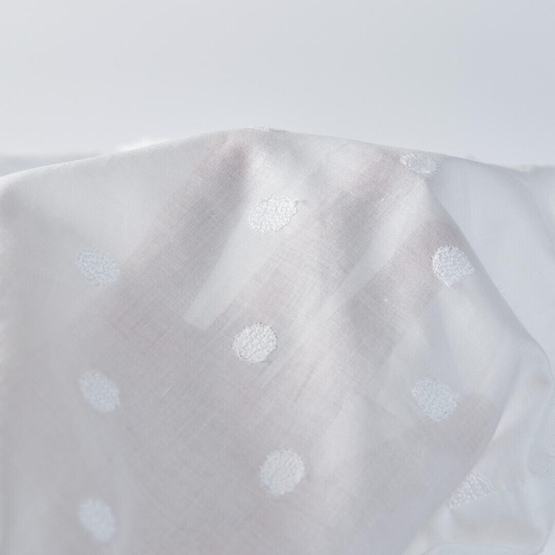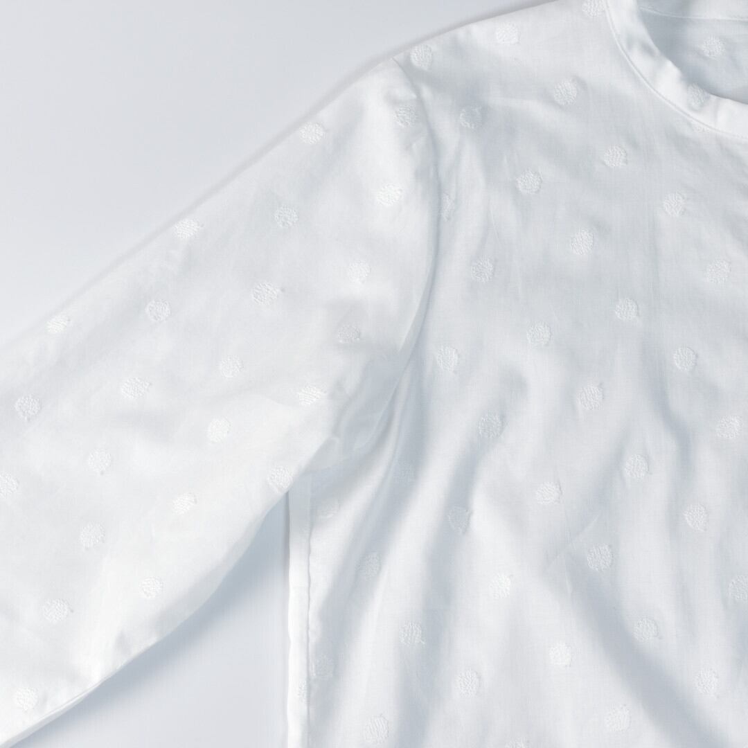 【商品詳細】軽くて薄手のコットンに水玉模様の刺繍が施されたノスタルジックな雰囲気のシャツカーディガン。真夏の冷房対策や日ざし避けにも重宝する長袖の羽織りです。