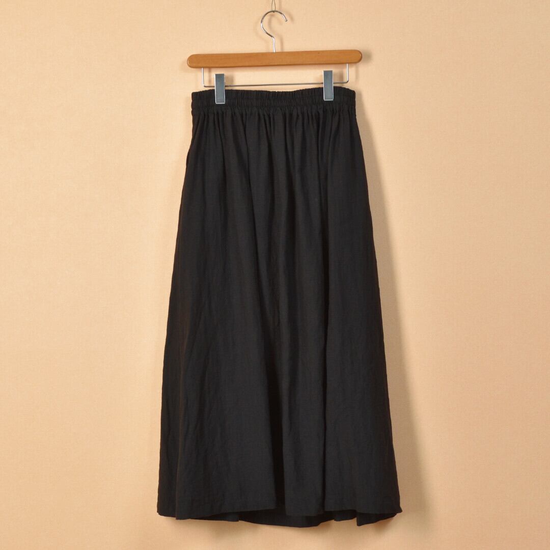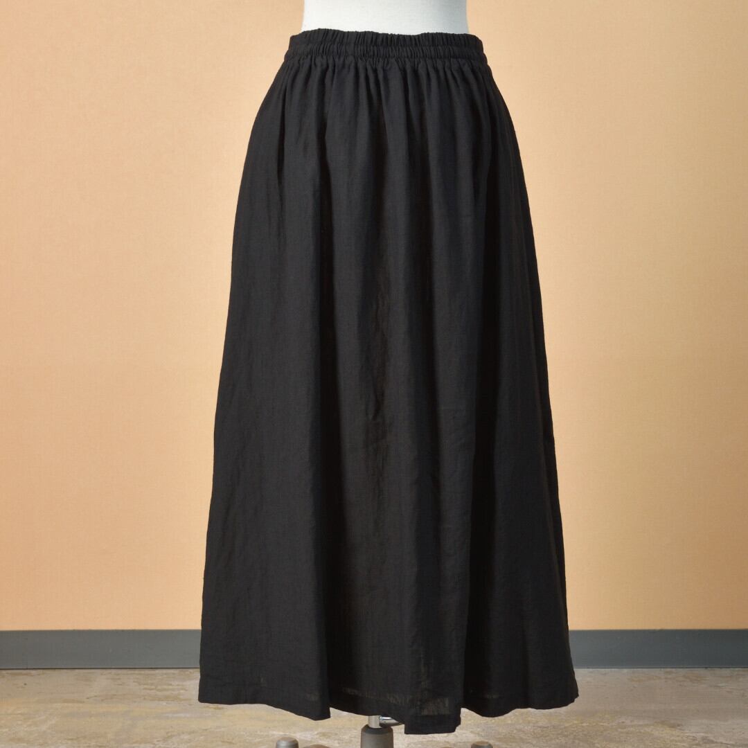 夏の暑い日でも涼しく快適に穿いていただけるリネン素材のギャザースカート。黒のカラーはどんなトップスとも相性抜群で、着回し力抜群です。カジュアルにもきれいめにも合わせやすい一枚。ぜひ、あなたの夏コーディネートに取り入れてみてください。