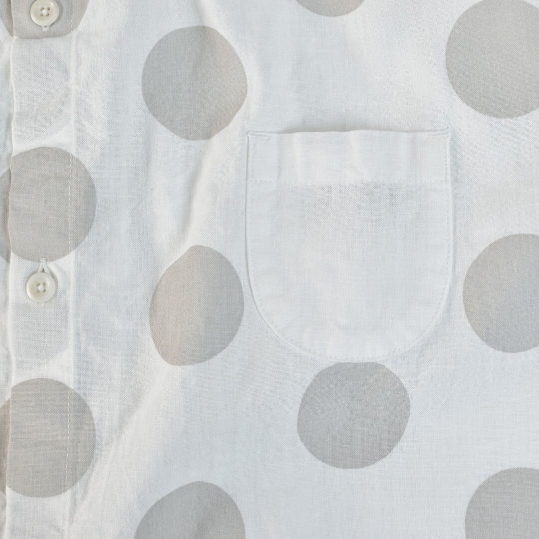 【商品詳細】日本綿布によるダンガリー生地は力織機で織り上げられた快晴堂の定番生地です。ザックリとした肌触りが特徴で春夏のアイテムに最適です。45mm/28mm/15mm/3mmの水玉を使い分けて快晴堂らしいチュニックに仕上がっています。