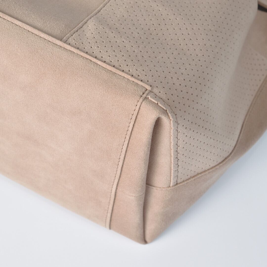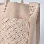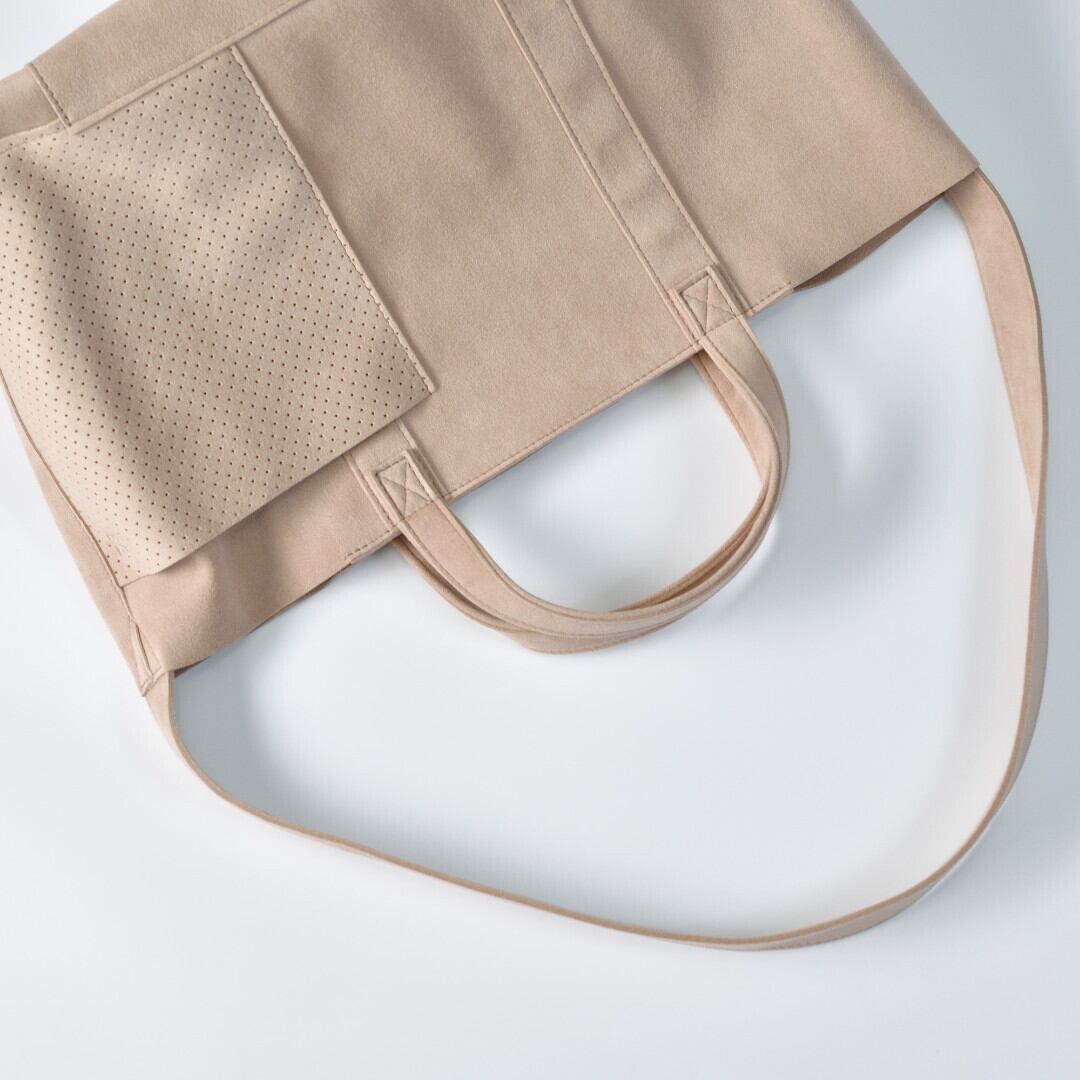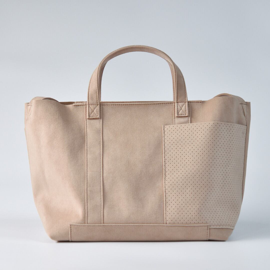 【商品詳細】マイクロファイバー『ウルトラスエード』を使用したミディアムサイズのトートバッグです。パーツを重ね合わせた贅沢な仕様になっています。外側にはパンチング加工の2つのポケットがあり、内側には2つのオープンポケットが装備されているとても使いやすい仕様です。開口部はスナップ留めの長方形フラップで目隠しができます。斜め掛け可能なショルダーストラップがついています。180gというとても軽いバッグです。家庭洗濯が可能です。