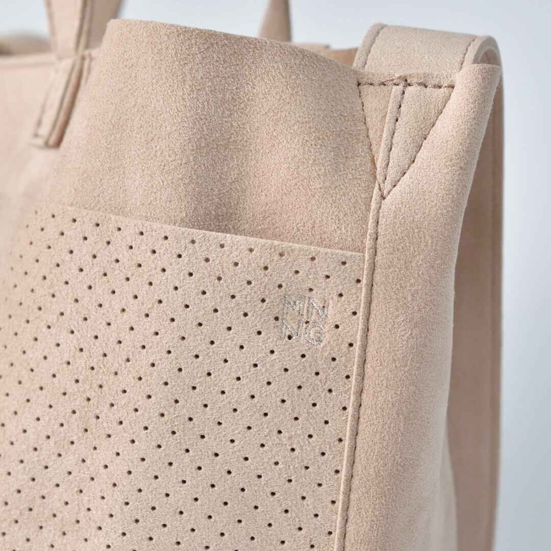 もののぐの新しいライン「MNNG]。東レが開発した人口皮革ウルトラスエードを使ったバッグやアクセサリーがメインアイテムとなります。ウルトラスエードはイタリアの高級家具メーカーが作るソファーや、スーパーカーのシートなどに使われるほどの質感と耐久性は折り紙つきです。また、ご家庭で洗濯をして頂いてもその色や質感は殆ど変わりませんので、明るい色目の物でも安心してお使いいただけます。