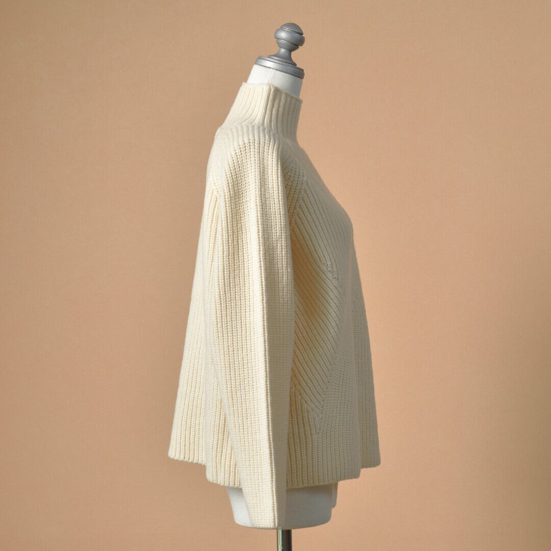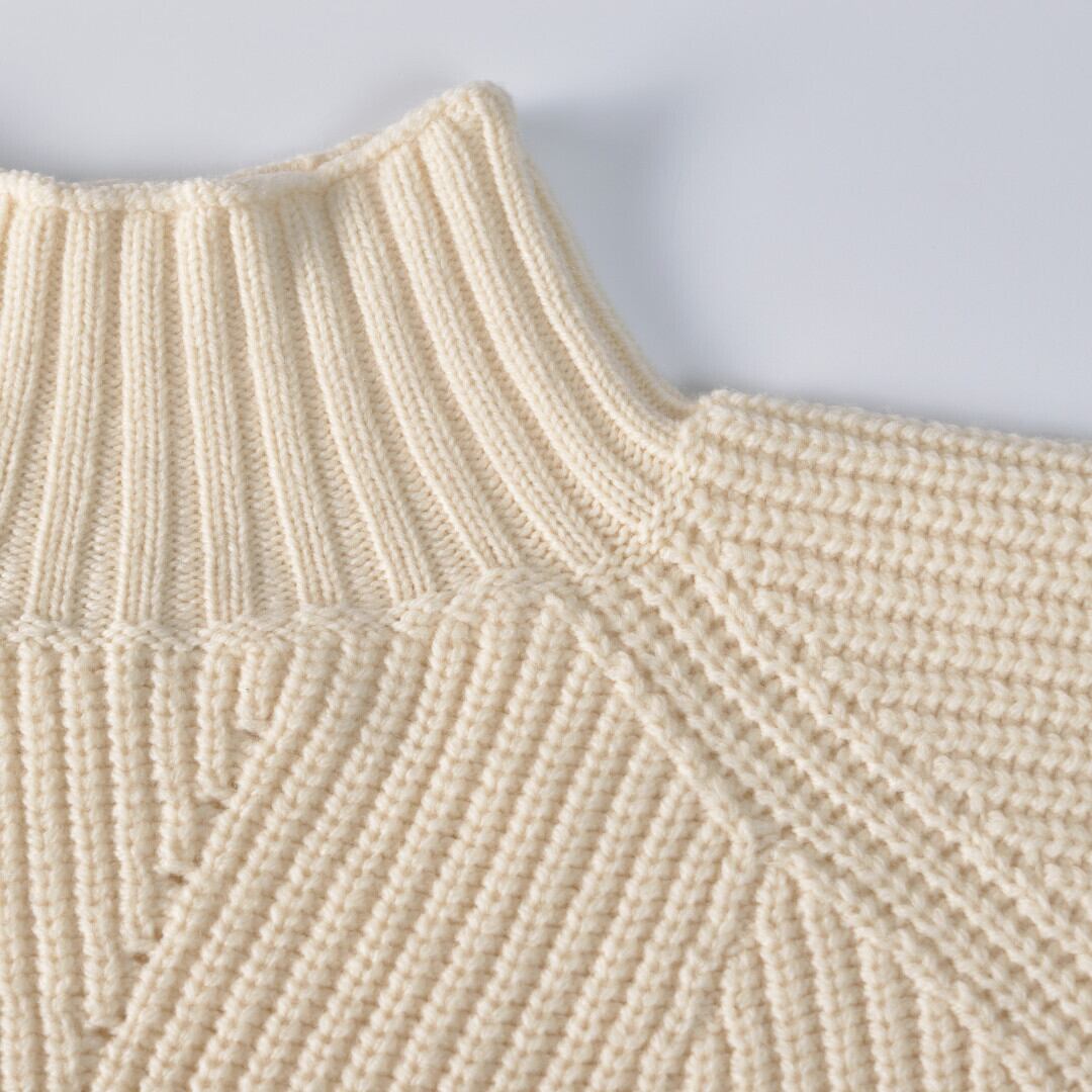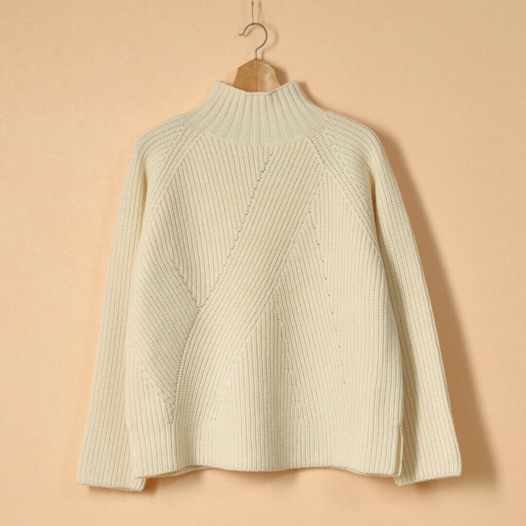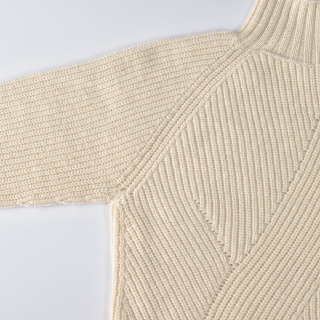 【商品詳細】チクチクが少ないロッキーメリノウールを使ったニットです。前身ごろがランダムな畦編みを施すことでモダンな印象のニットになっていますね。これならシンプルなデザインでもコーディネートのポイントとなります。真冬はコートのインナーとしてもおススメです。