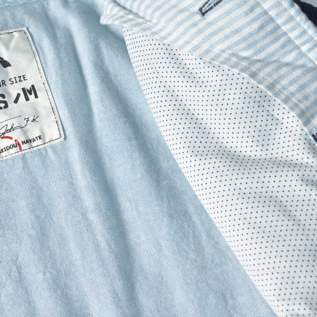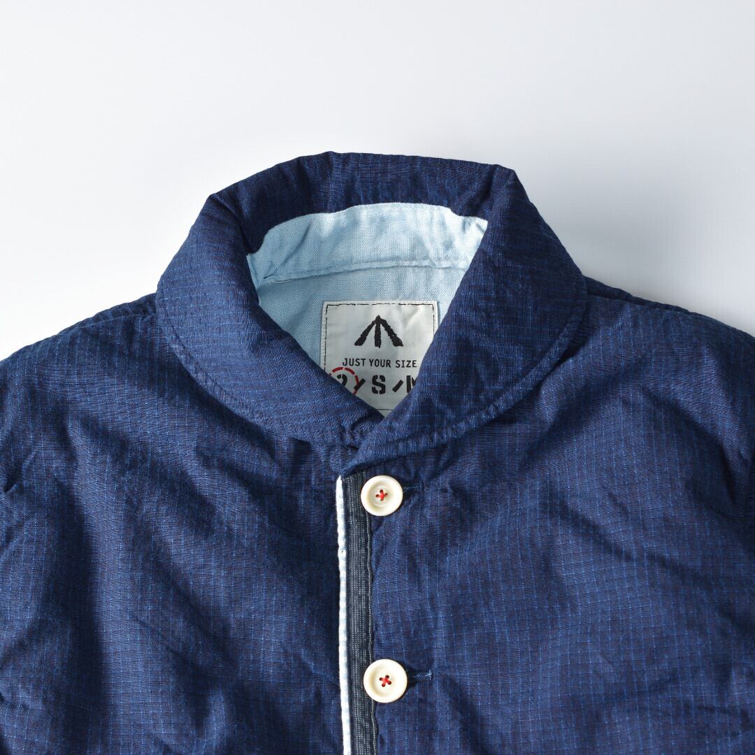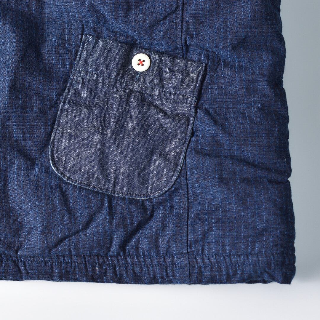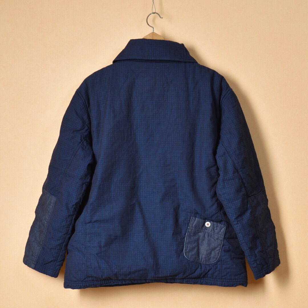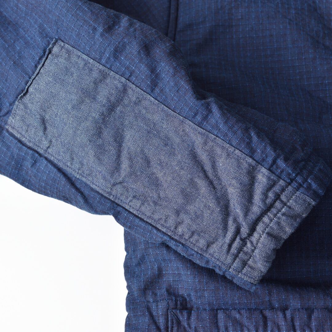 【商品詳細】日本綿布による快晴堂オリジナル生地に中綿を入れたブルゾンです。後染めでは無く糸から染めた先染め糸を使って手間のかかるジャガード織機を使った拘りの生地が使われています。先染めのインディゴ生地はジーンズとと同じで経年変化が楽しめます。