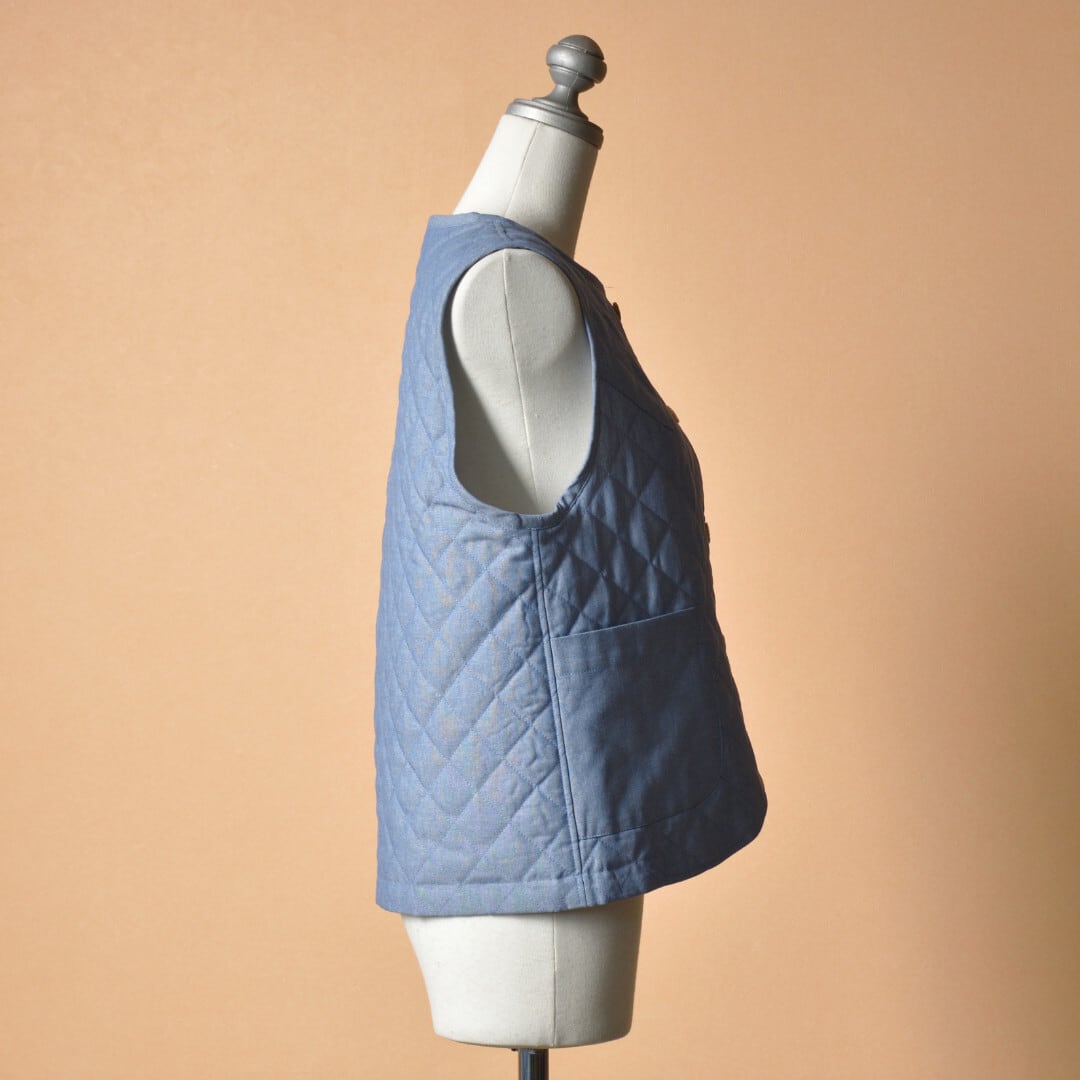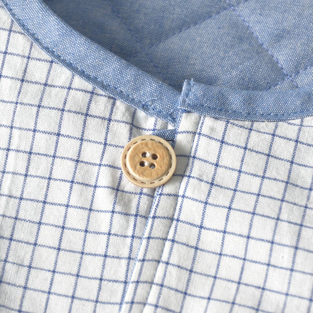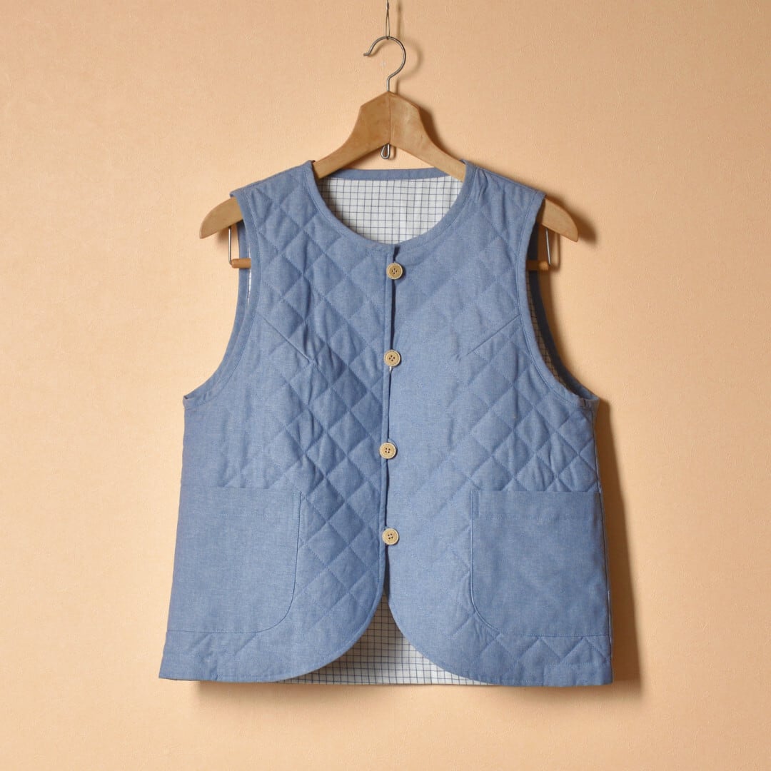 【商品詳細】コットンシャンブレー生地を使った薄い中綿キルティングとインドのカディーコットン生地のモノグラムチェックを使ったリバーシブル仕様となっています。丁寧な縫製とキレイなシルエット、アクセントとなるポケットもサラウエアらしい素敵なベストに仕上がっています。